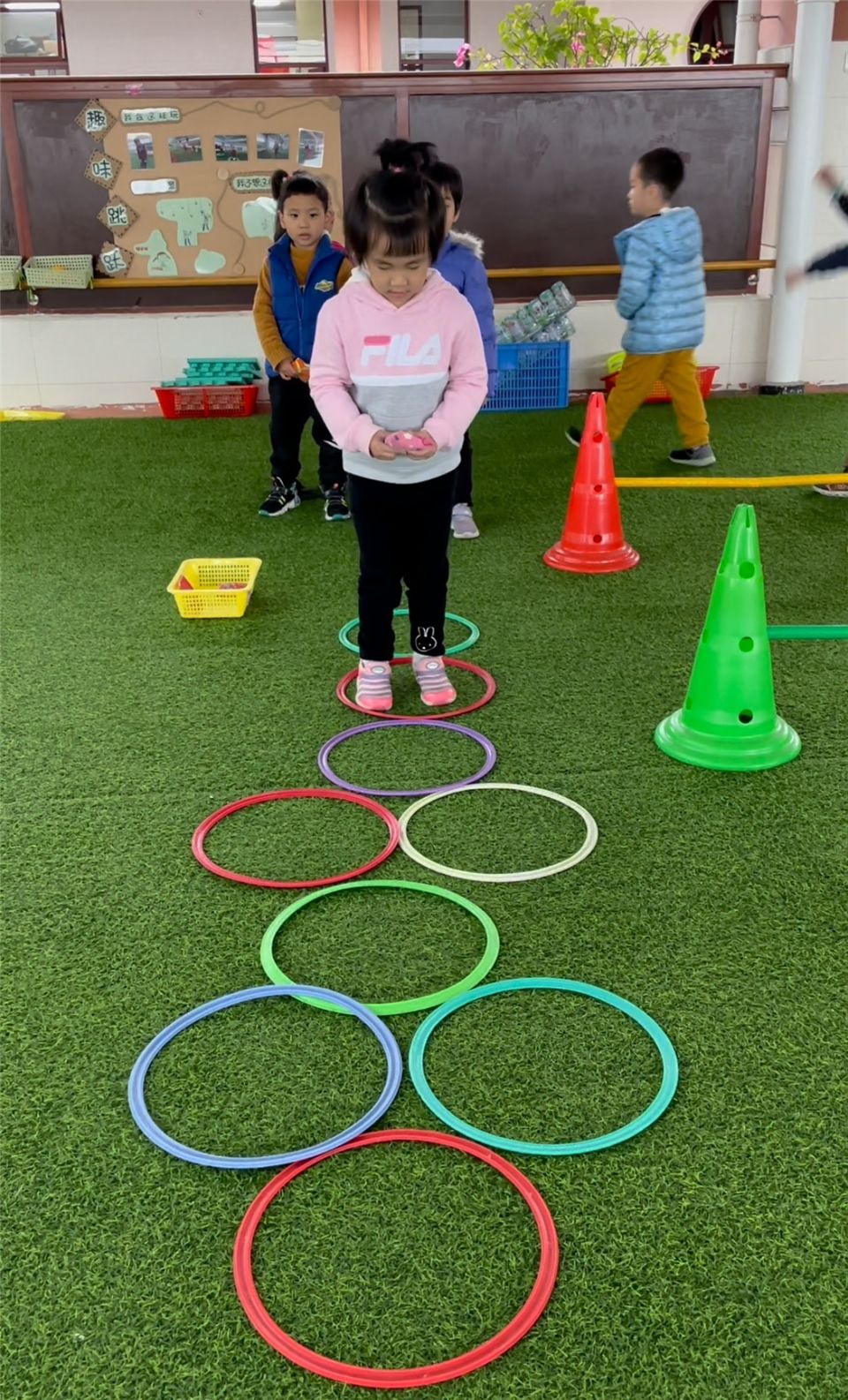 沙包和呼啦圈在一起还可以玩跳格子哦!