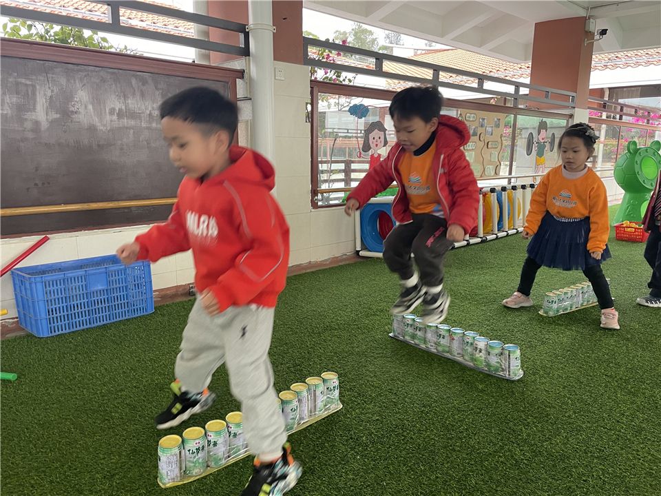组合起来的易拉罐,我们可以拿来用双脚在两侧向前行径跳。