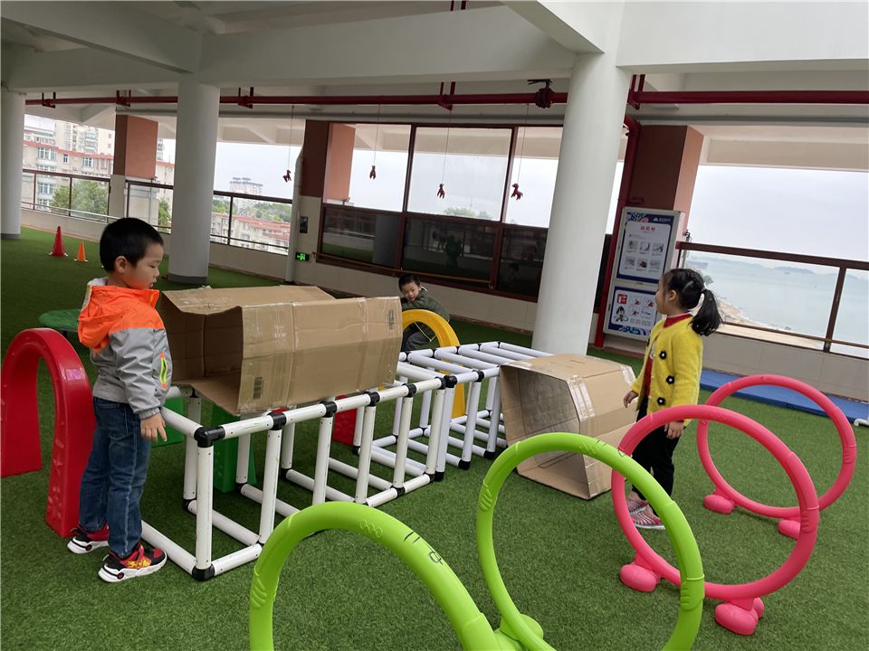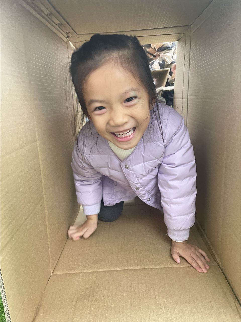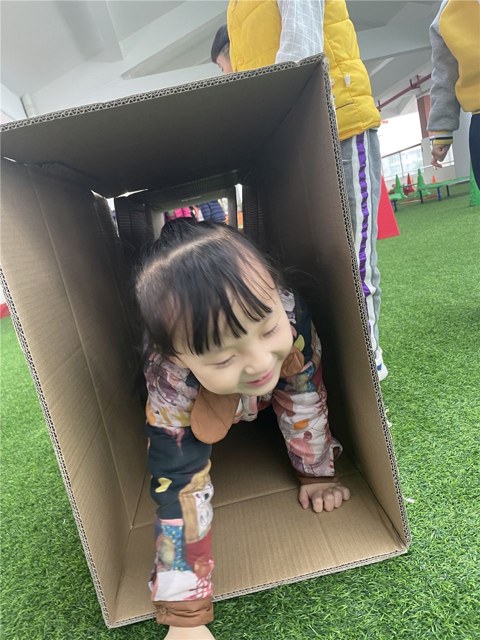 “老师,这个可不是纸箱,这是我们的时空隧道。要穿越时空隧道才算挑战成功,才可以通往下一个更好玩的地方。”