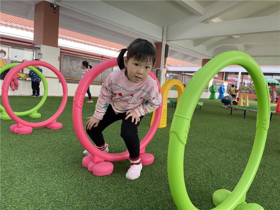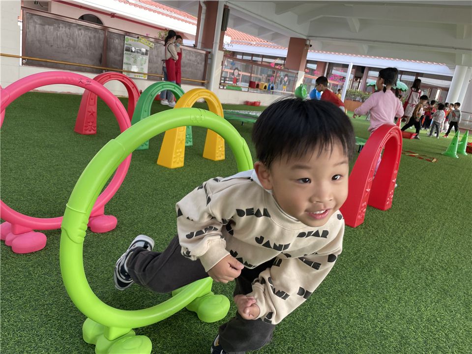 不一会小朋友找来了更多的轮胎架,这下钻爬区可就更热闹了起来,许多小朋友看到也想来试试,直到户外活动结束还舍不得走呢!