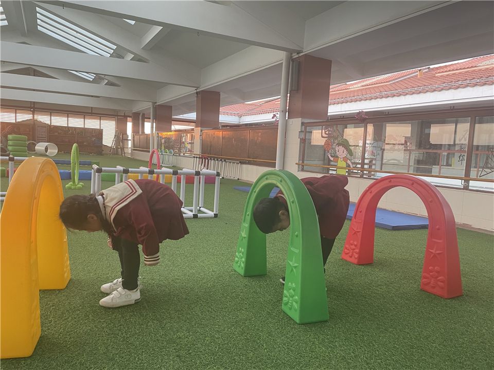 瞧!小朋友们弯下腰,慢慢的走过去了。