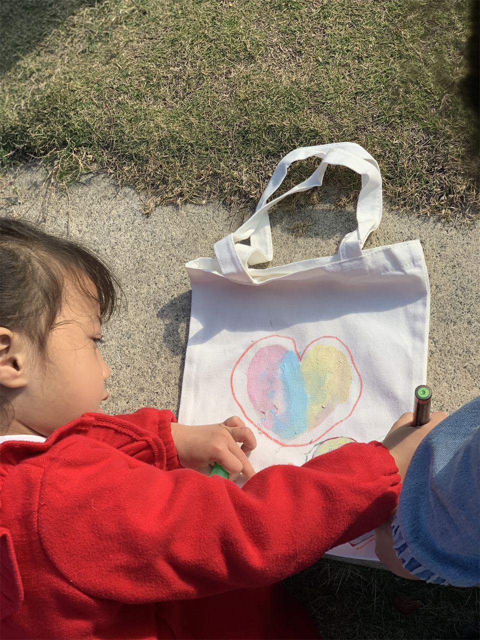 用图形拓印板放在帆布袋上,用海绵棒蘸取喜欢的颜料放在拓印板上进行拓印,哇~漂亮的“爱心”和“70”帆布袋就出来了~拿出画笔,我的厉害本领会让它变得更加漂亮噢~