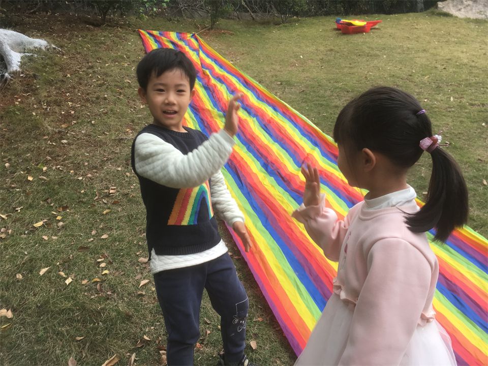 有办法了!把彩虹滑草布的正面翻过来,再把它铺平,整片滑草布都要铺平才能滑。耶~我们做到了,击掌庆祝吧!