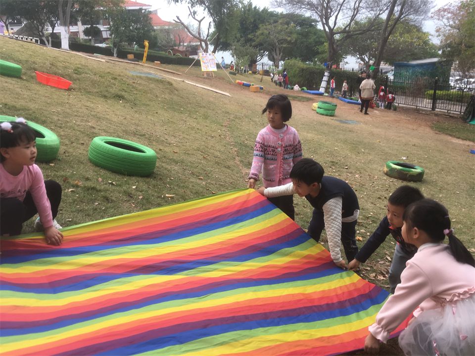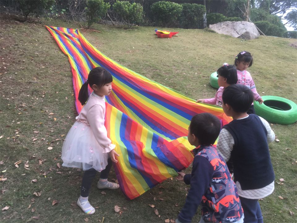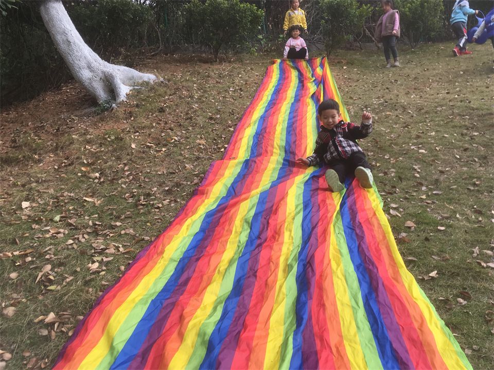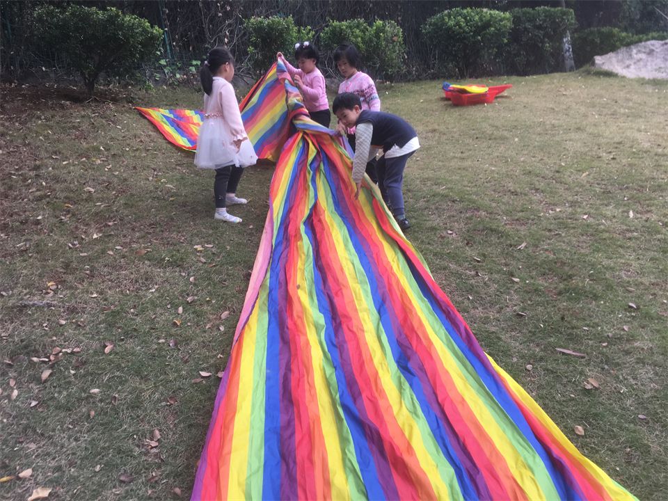 糟糕,我们的彩虹滑草布中间打不开了!不怕不怕,聪明的我们一定可以把它打开的。