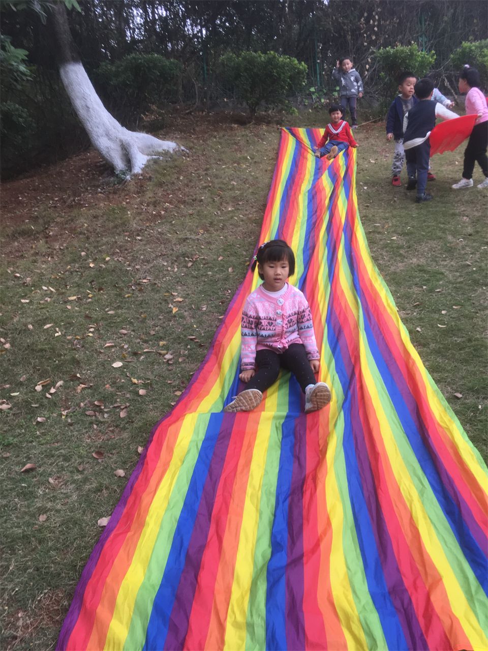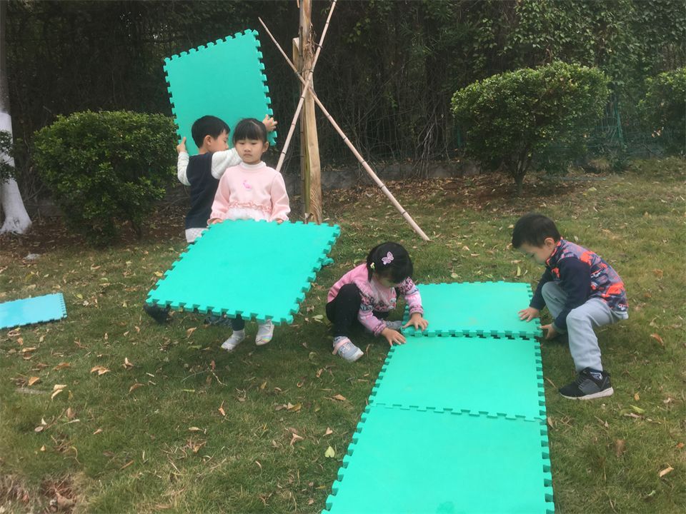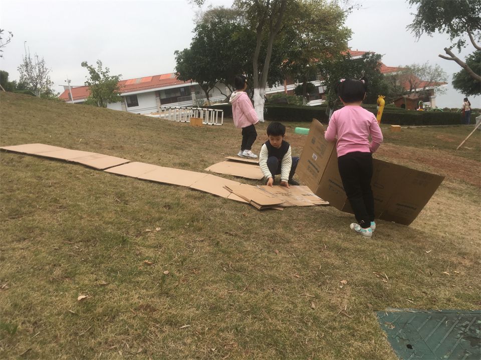 孩子们知道美丽的小山坡可以来玩游戏时,都兴奋不已。于是呀,他们决定在小山坡进行滑草游戏,并决定自己来设计游戏的玩法~“我要把垫子都连在一起,变成长长的滑草道~”;“彩虹滑滑溜布可以和垫子一起放在比赛,看看哪一个更好滑~”;“我要和我的好朋友一起比赛玩纸板~”