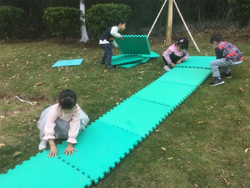 阳光明媚,美好的晨间活动开始啦~我们自己来搬玩具吧~你搬垫子,我来摆~长长的垫子滑道就摆好啦~