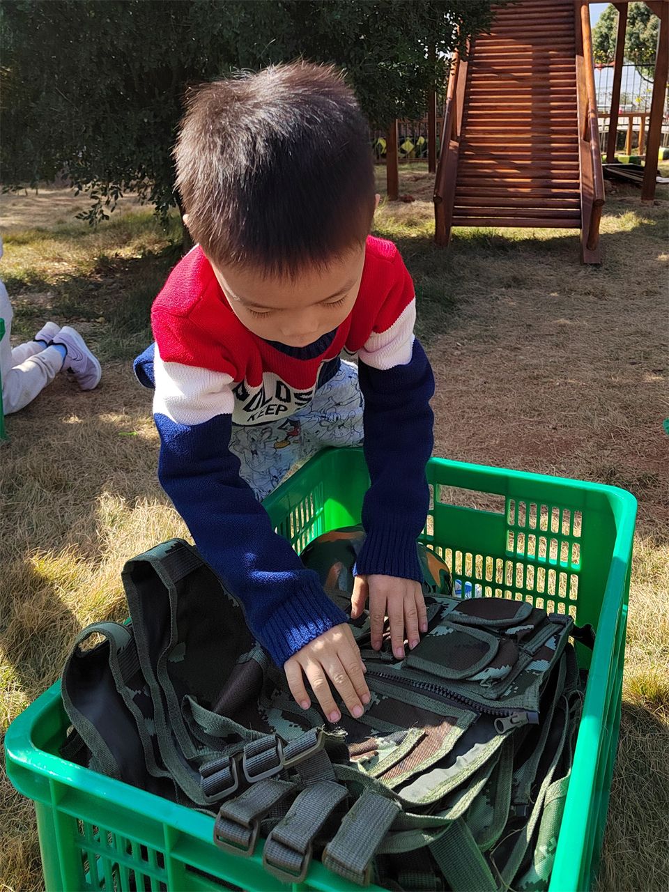 几轮交战下来,小军人们都筋疲力竭,大家纷纷脱下自己的战衣叠叠整齐,又把自己手中的武器分类收拾的清清楚楚。伴随着轻柔的音乐,中五班的萌娃们踏着快乐的步伐结束了本次野战基地之旅。