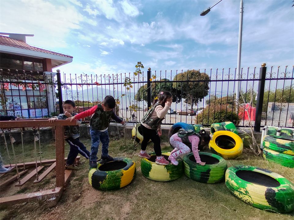 组长冲锋在前,率领着自己的小组员,按照既定的路线出发训练。翻越轮胎堆积成的山,轮胎小山有好多黑黑的洞洞,走不稳就要掉下去了呢;走过摇晃的荡桥,萌娃们想象着自己脚底下有一条湍急的河流,太刺激啦;跨过轮胎障碍物,悠优气喘吁吁的说:“这轮胎也太难爬了叭,好高啊!我都是坐上去才能跨过去的。”翰翕小朋友组织小队员们搬来木梯,组成了错综复杂、高低不一的爬行训练路线。每个小组都在认真的进行作战前的“魔鬼训练”!