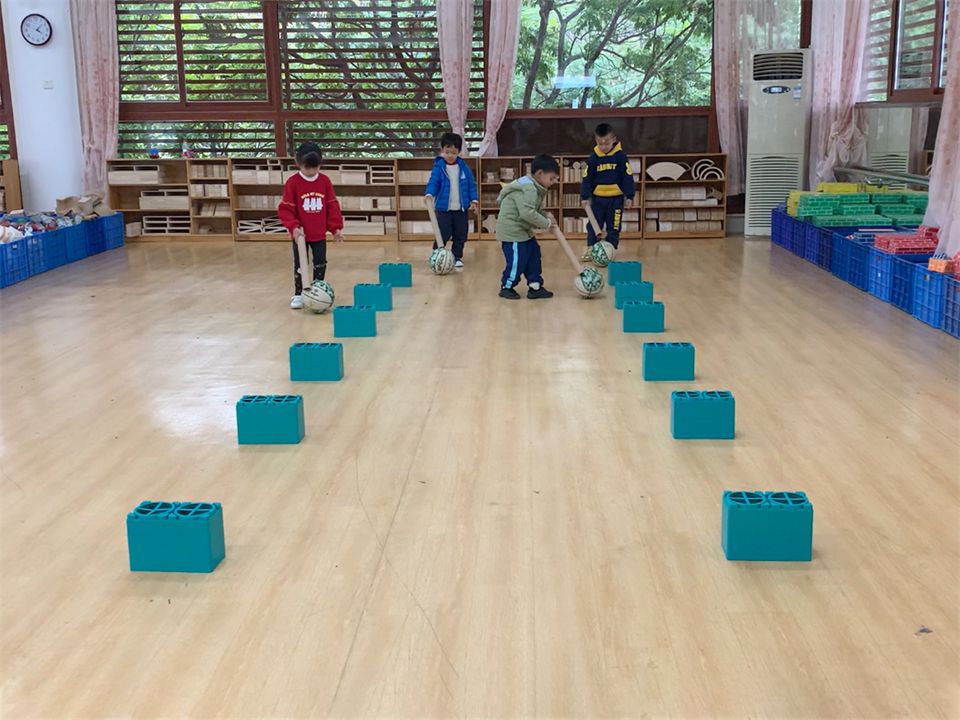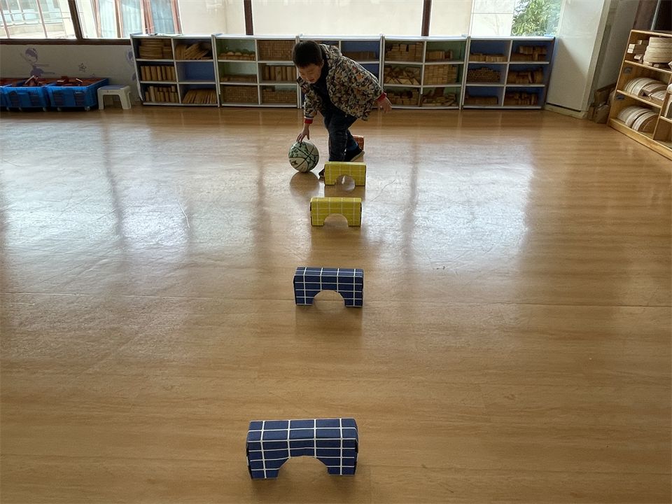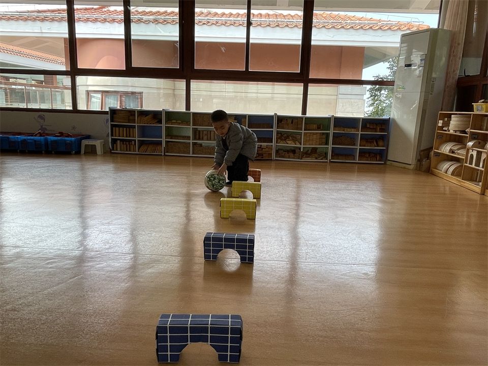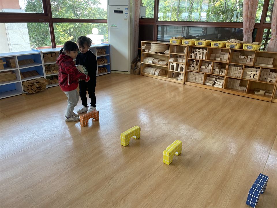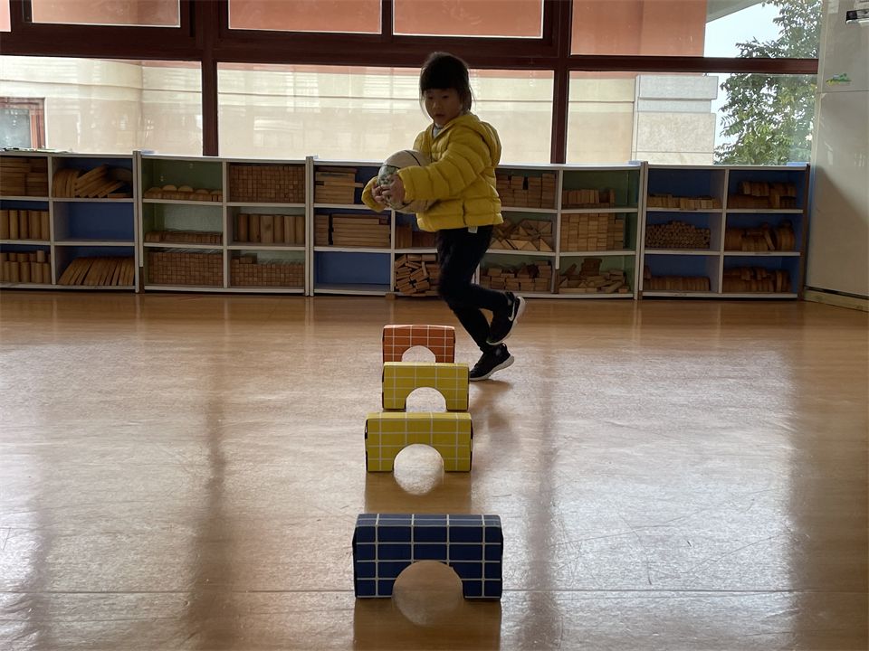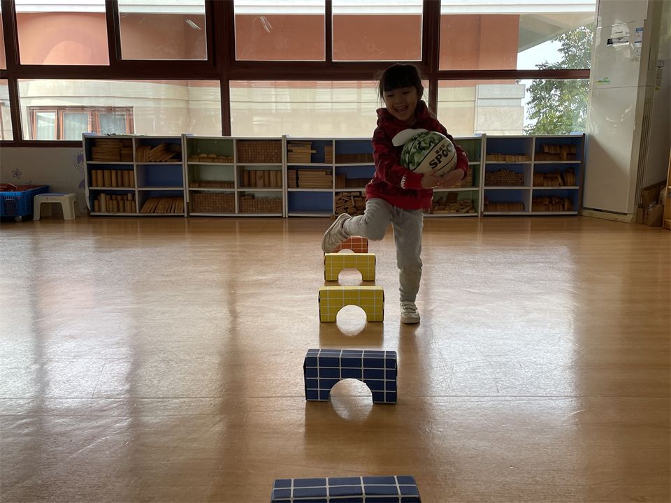加入积木,也可以和篮球一起做游戏呢!转着球滚过积木、抱着球单脚跳,超级好玩的游戏就诞生啦!