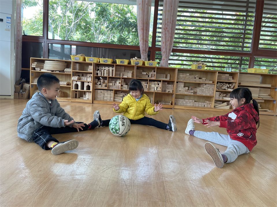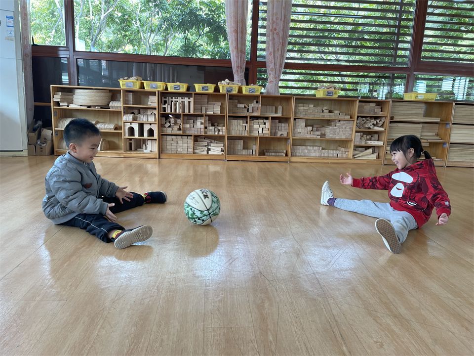 一起坐在地板上,张开腿变成小球门,你推着球过来,我来接。