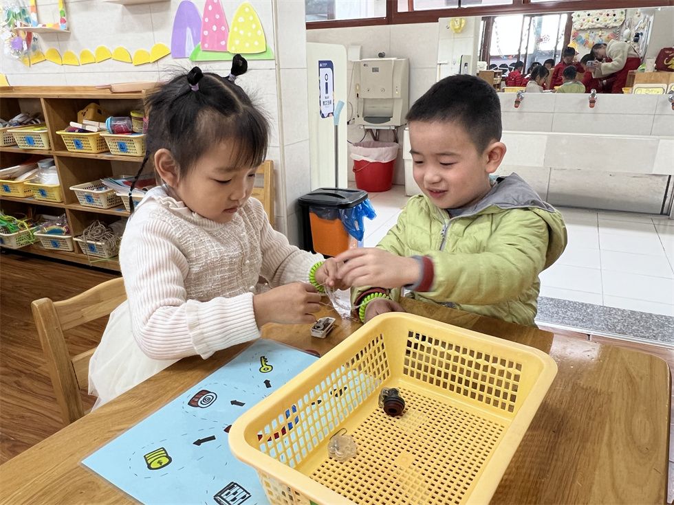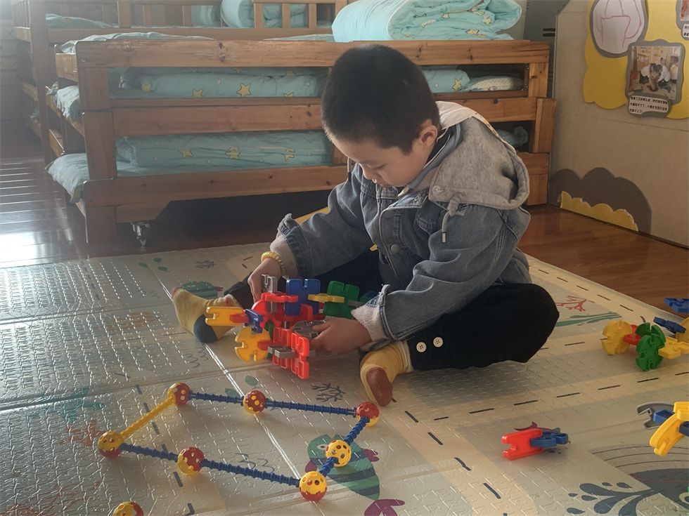 建构区几个认真拼插玩具的小家伙正在搭建自己的工程。鹏鹏用积塑材料拼插了一架飞机;另一边,祥溪和程程正在搭起一座立交桥,上面还有小汽车呢,滴滴滴开向了远方。