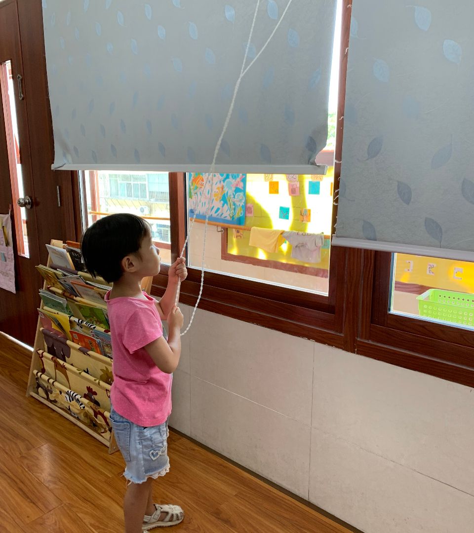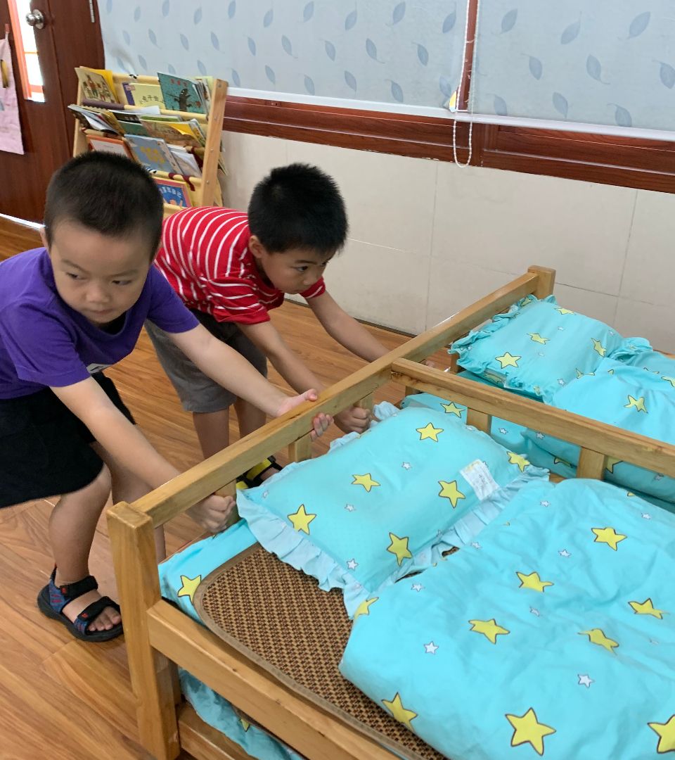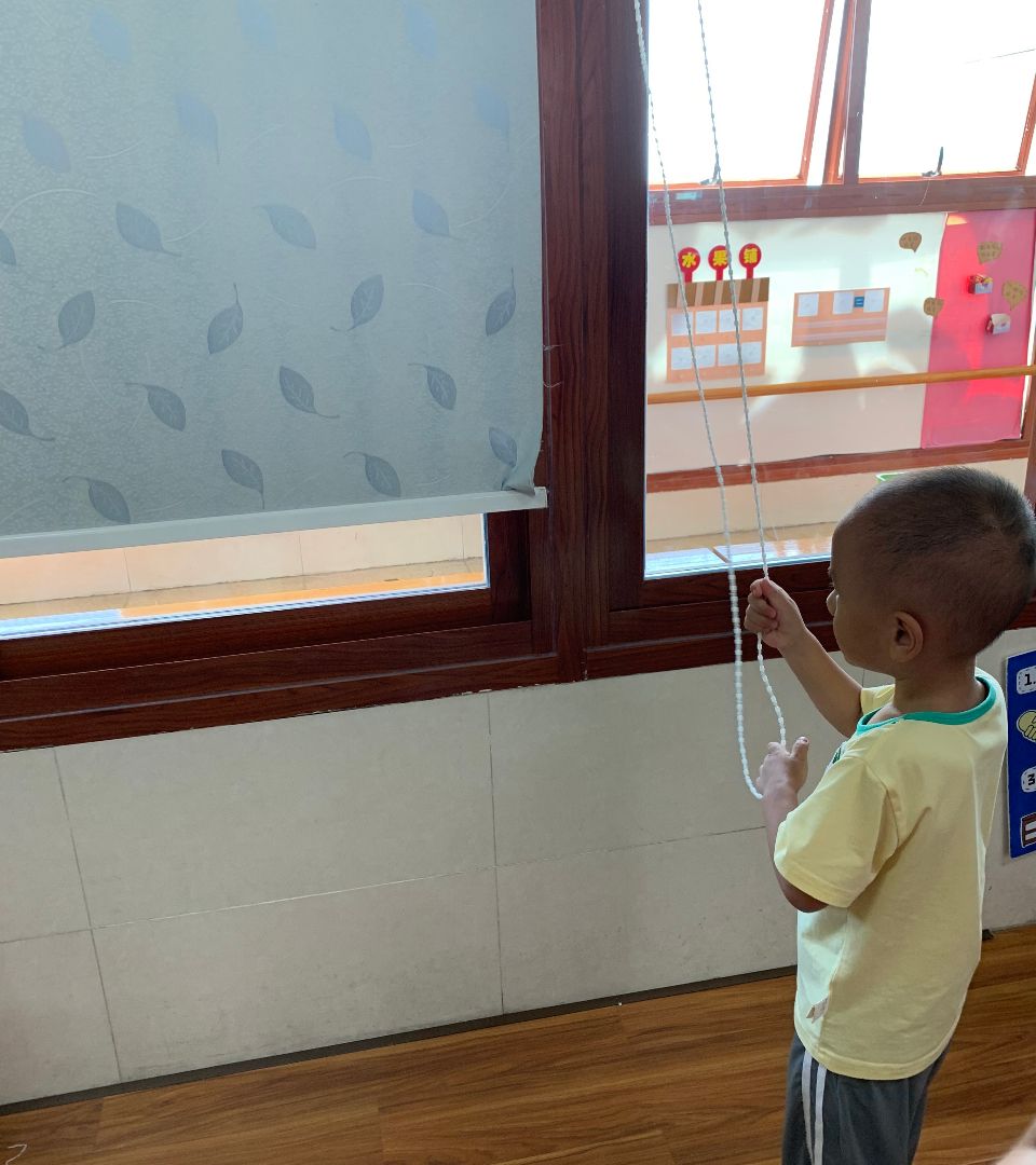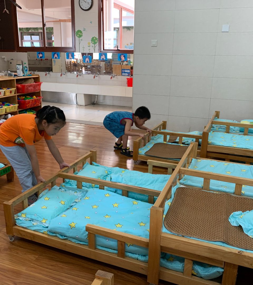 “老师,我来帮忙拉窗帘。”“老师,我来拉床铺!”
