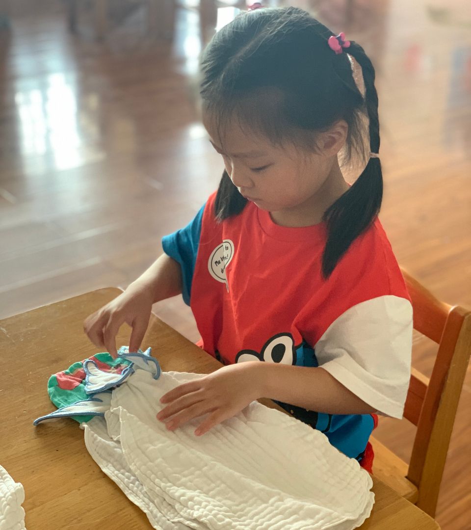 “王老师,我来帮你整理汗巾。”说完便马不停蹄地将手中的汗巾一块一块叠整齐。