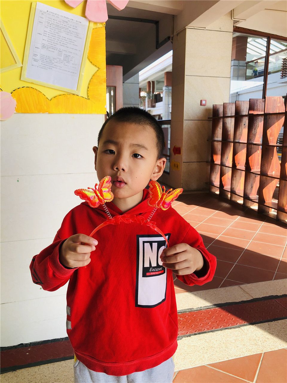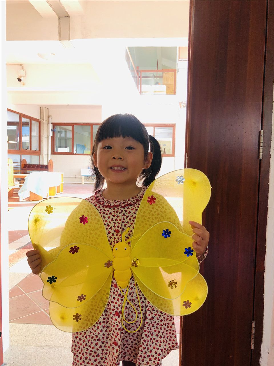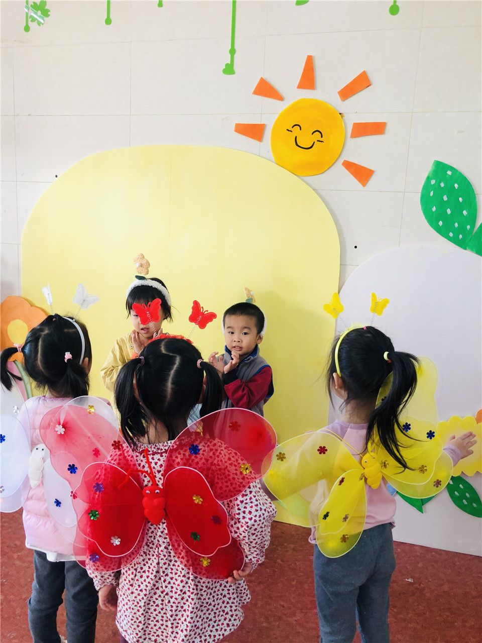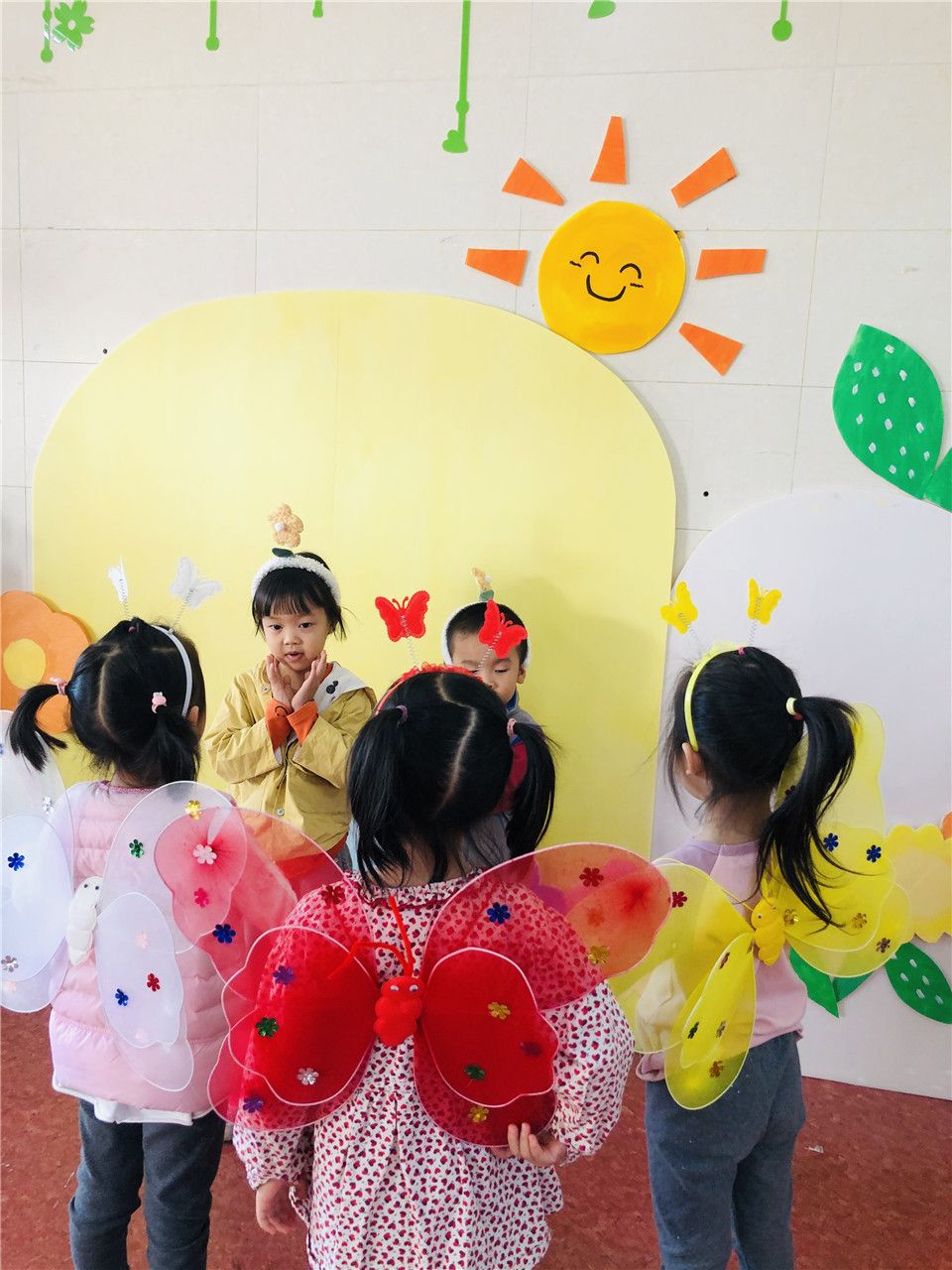 中八班的小朋友小手可真巧,道具准备好了,《三只蝴蝶》表演开始啦!请你们搬好小板凳坐下来一起看吧~
