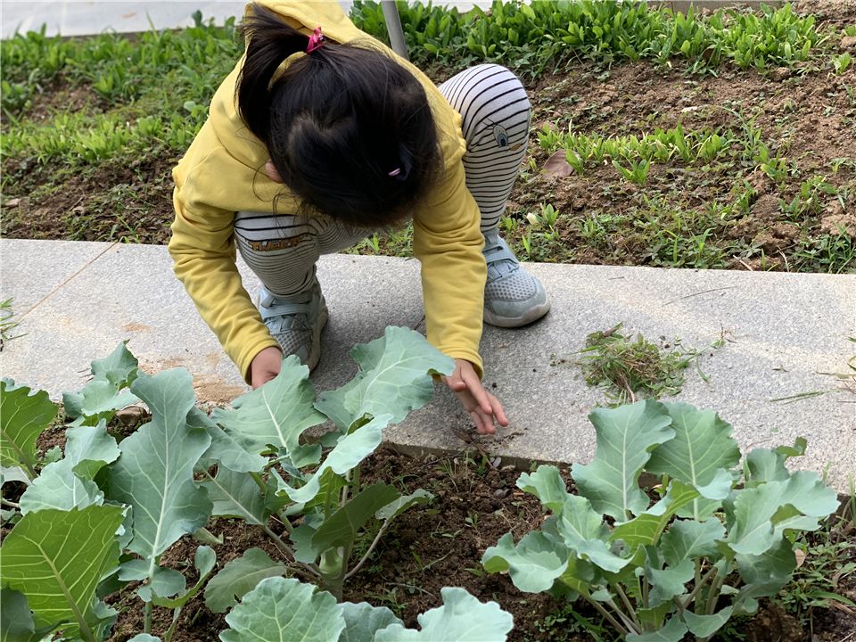 山坡上,一群勤劳的小园丁正用他们的小手拔去菜地里的杂草。