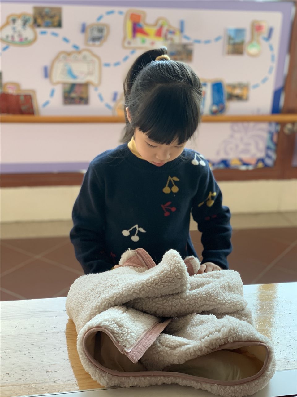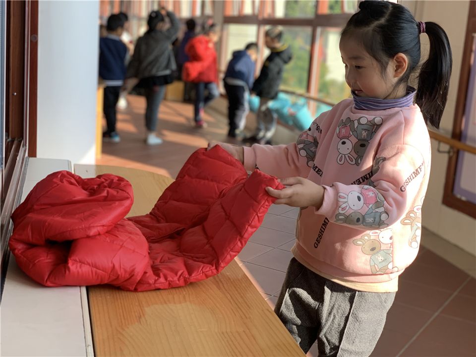 宝贝们一边念着儿歌,一边用能干的小手将自己脱下的外套熟练地叠整齐。