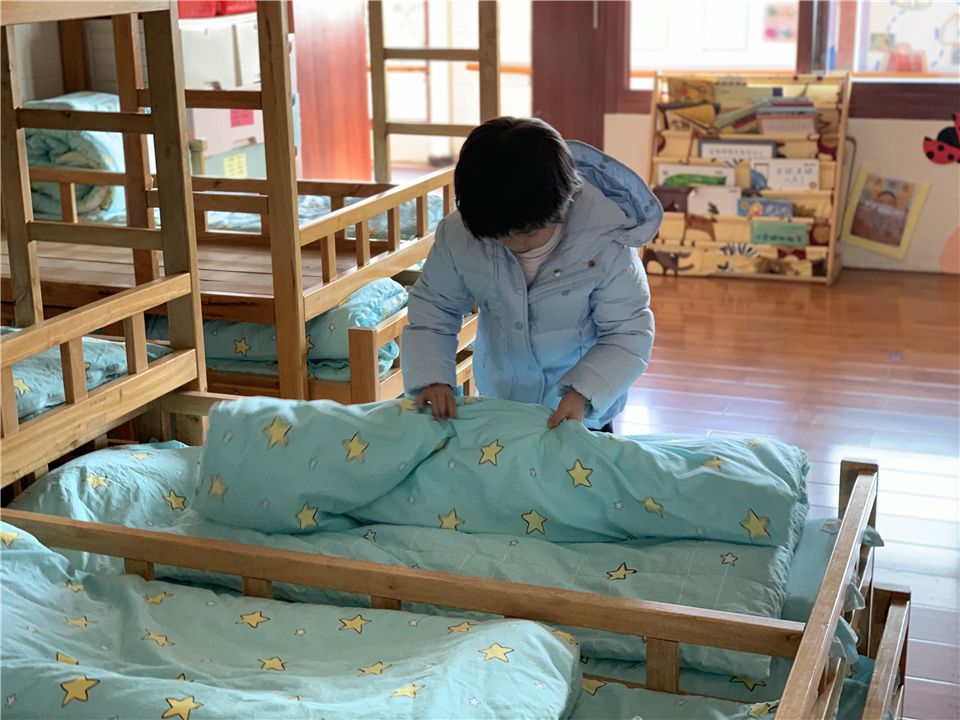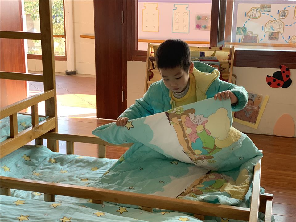 “老师,我能叠被子。在家我会帮着妈妈一起叠被子哦。”午睡起床,宝贝们一个个正专心致志地整理自己的小床。