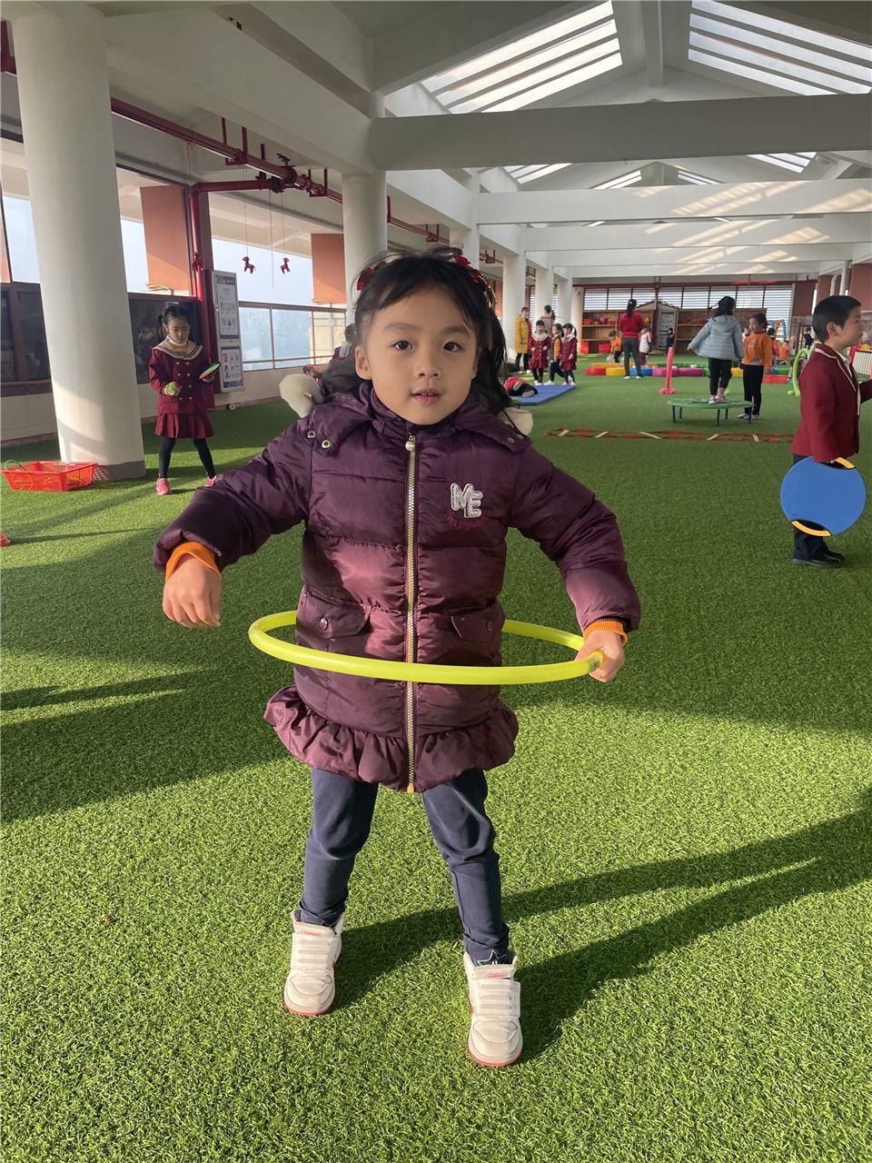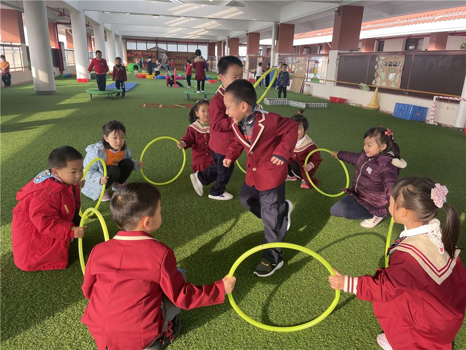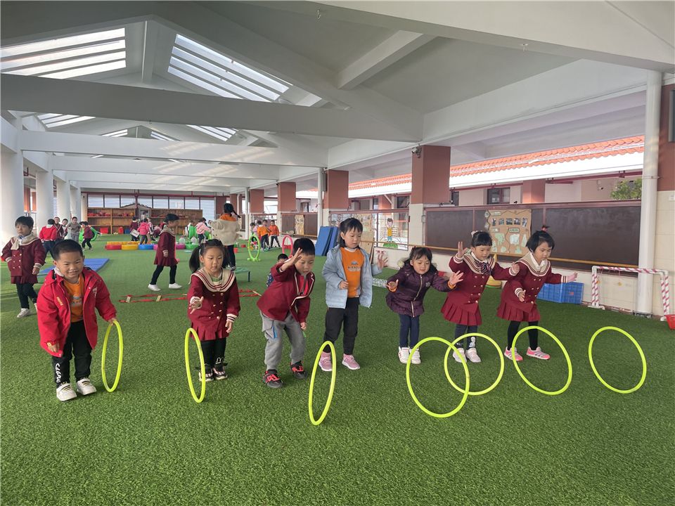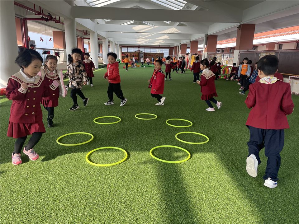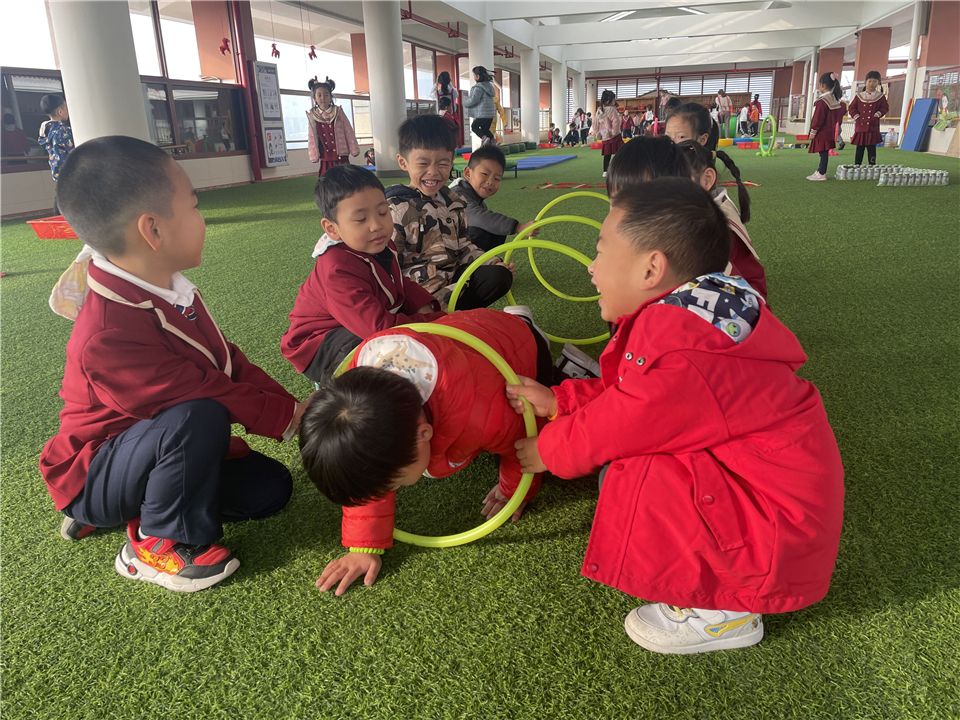 不一会儿,宝贝们将呼啦圈垂直在地面,呼啦圈变成了一排排整齐的山洞。宝贝们穿越时光隧道,追寻快乐的足迹。