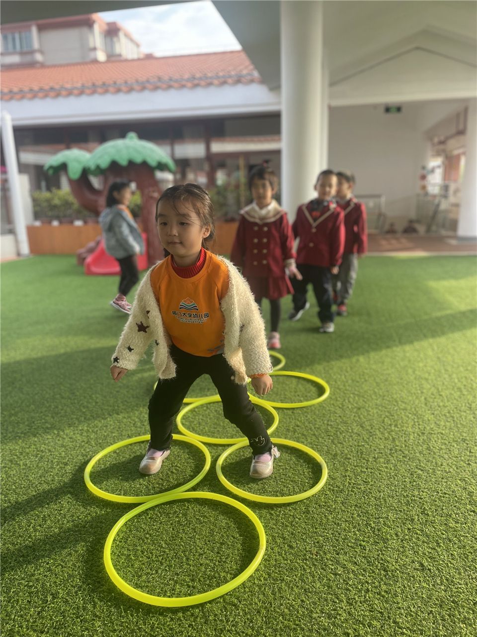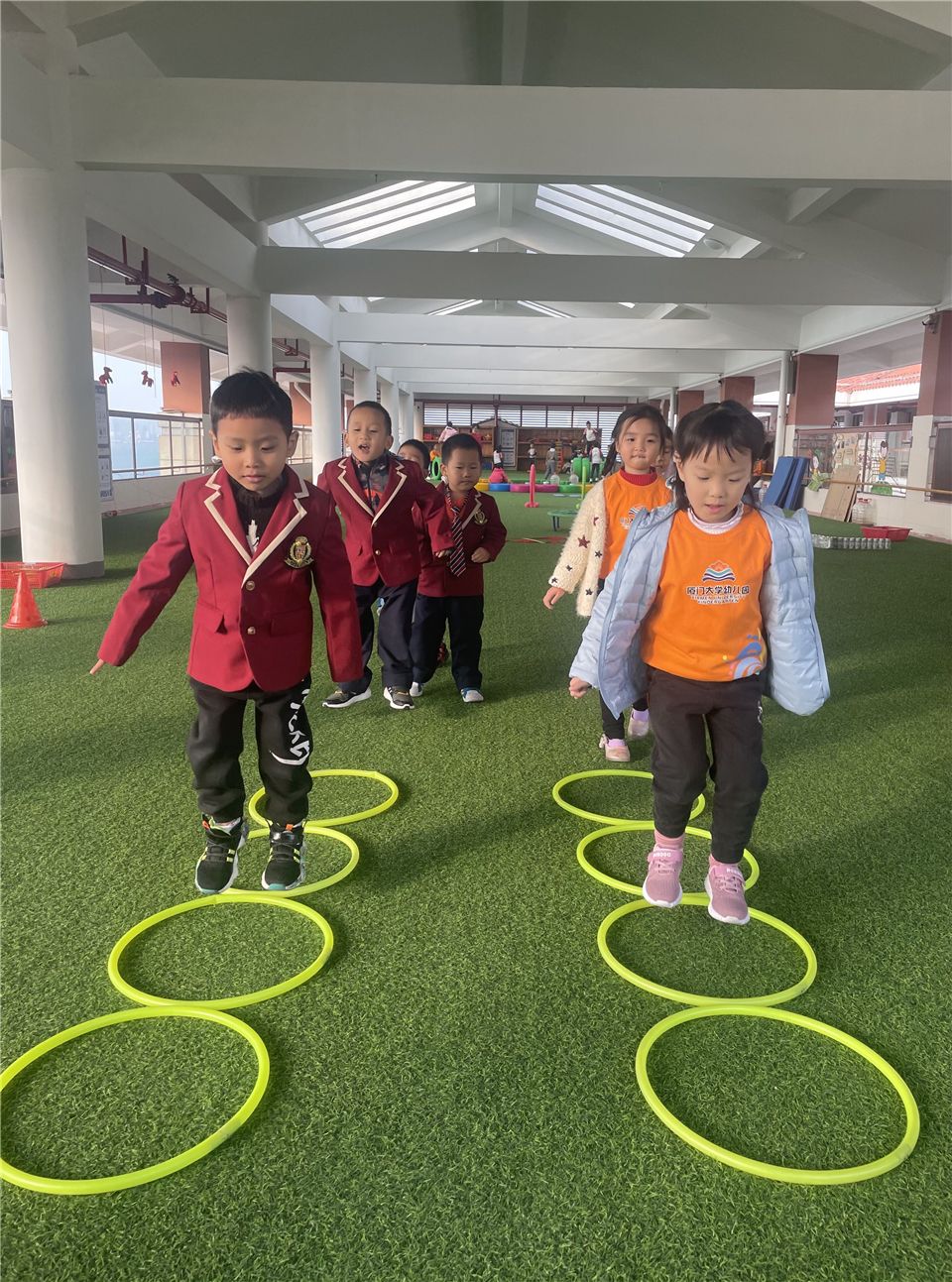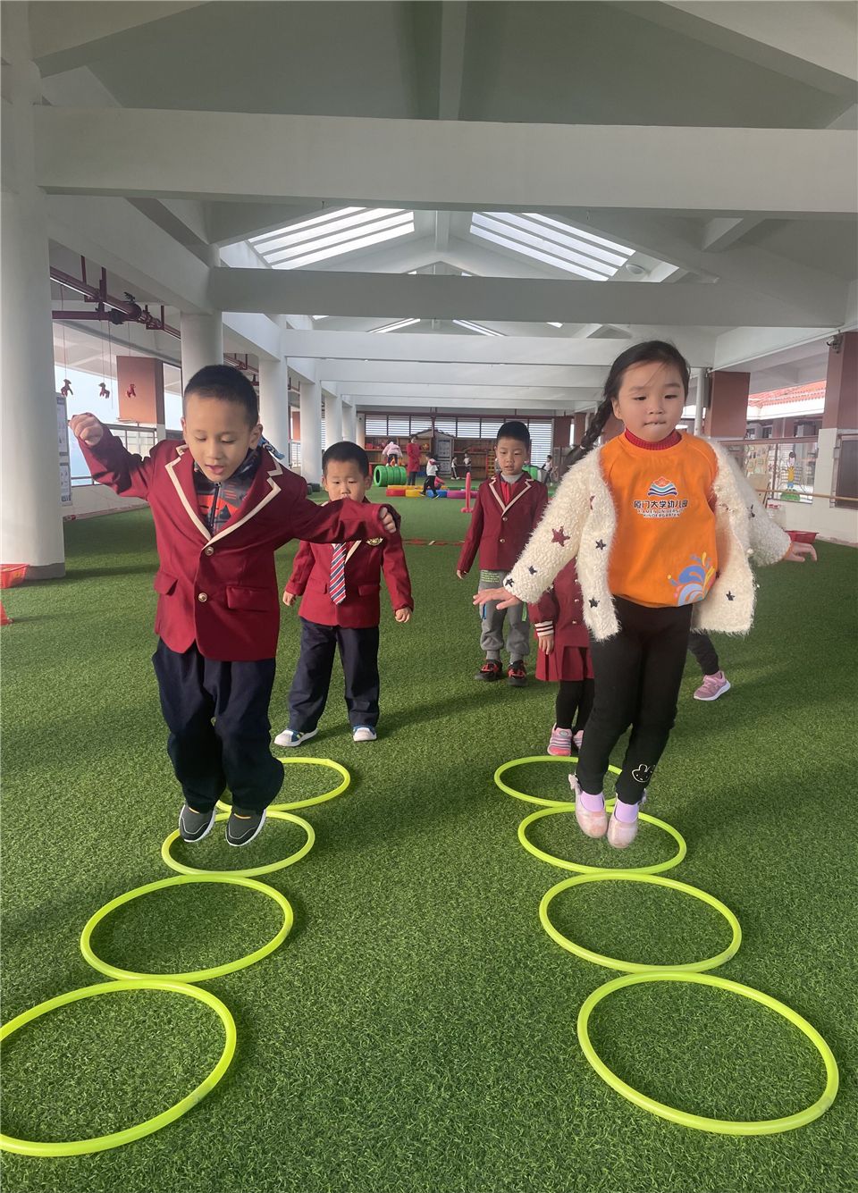 不一会儿,宝贝们将呼啦圈垂直在地面,呼啦圈变成了一排排整齐的山洞。宝贝们穿越时光隧道,追寻快乐的足迹。