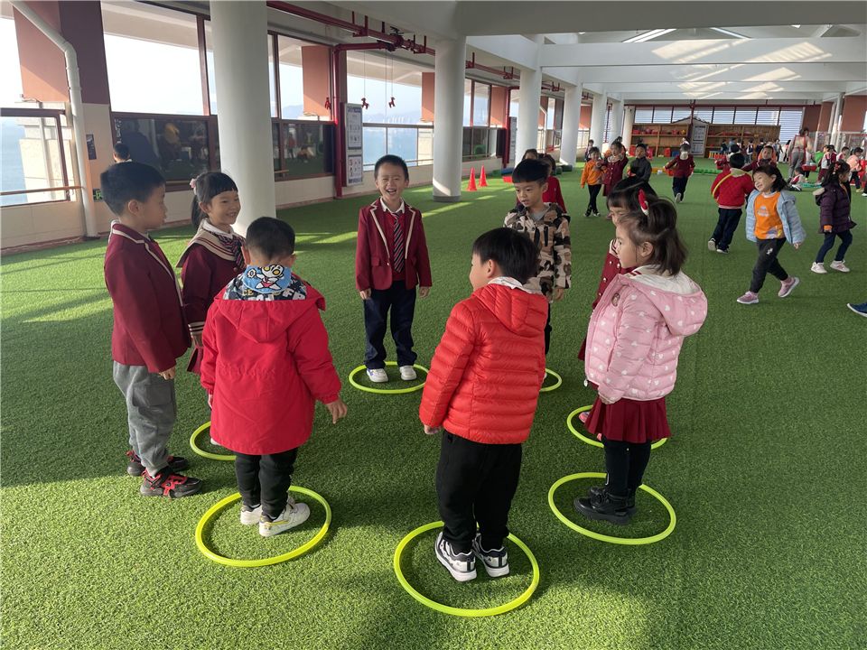 宝贝们用多个呼啦圈围成了一个圆圈,播放音乐后,他们绕圈跑,当音乐声一停,马上跳入圈中抢圈,一人一圈。看看谁能抢到最后一个圈哦!