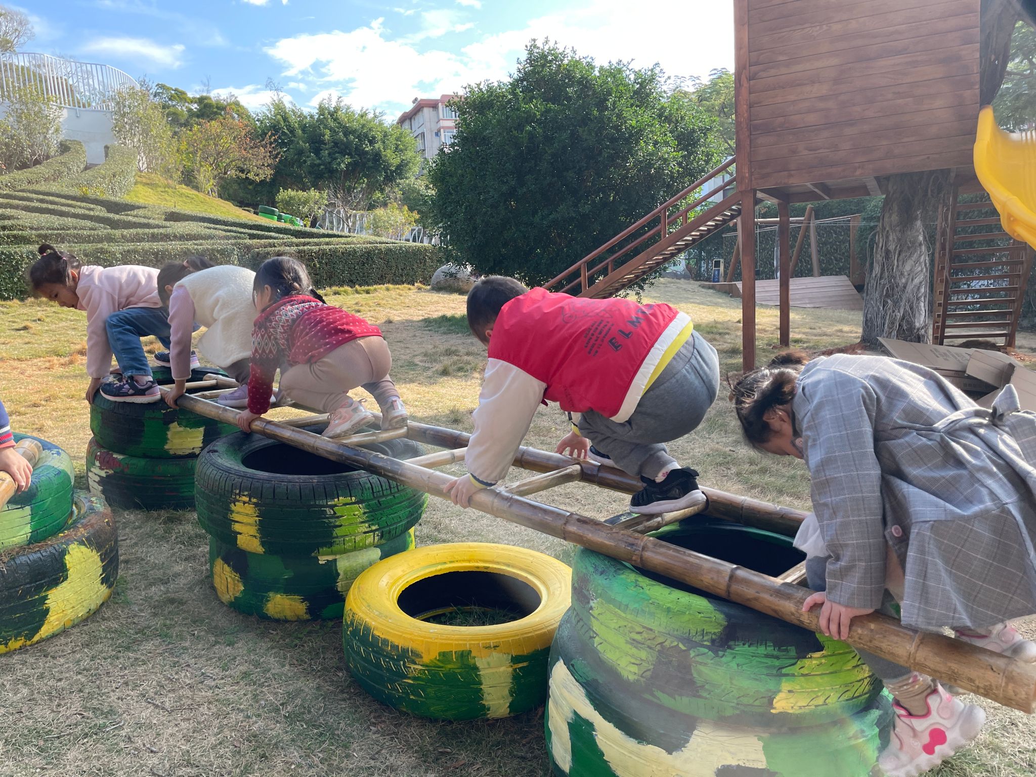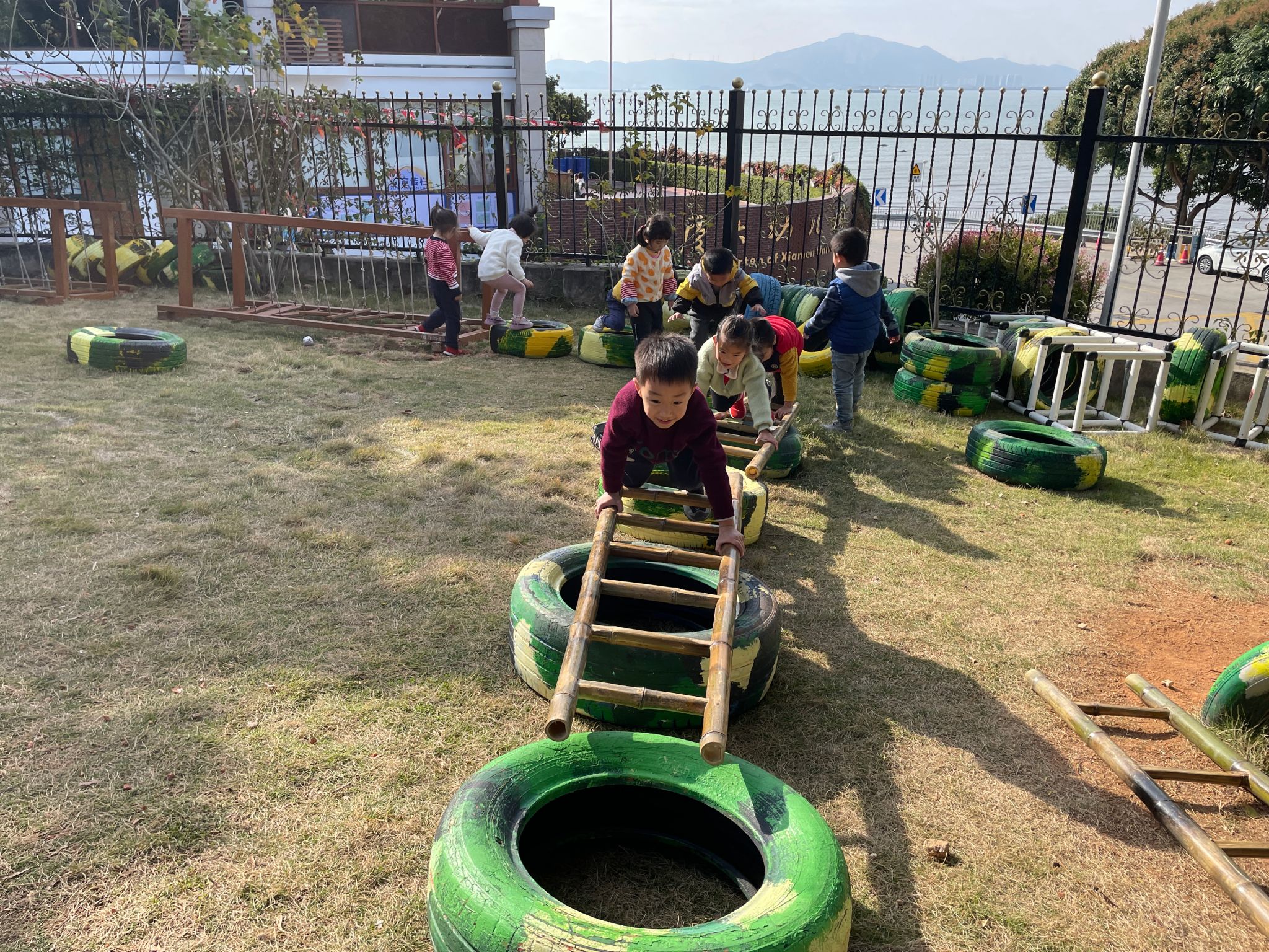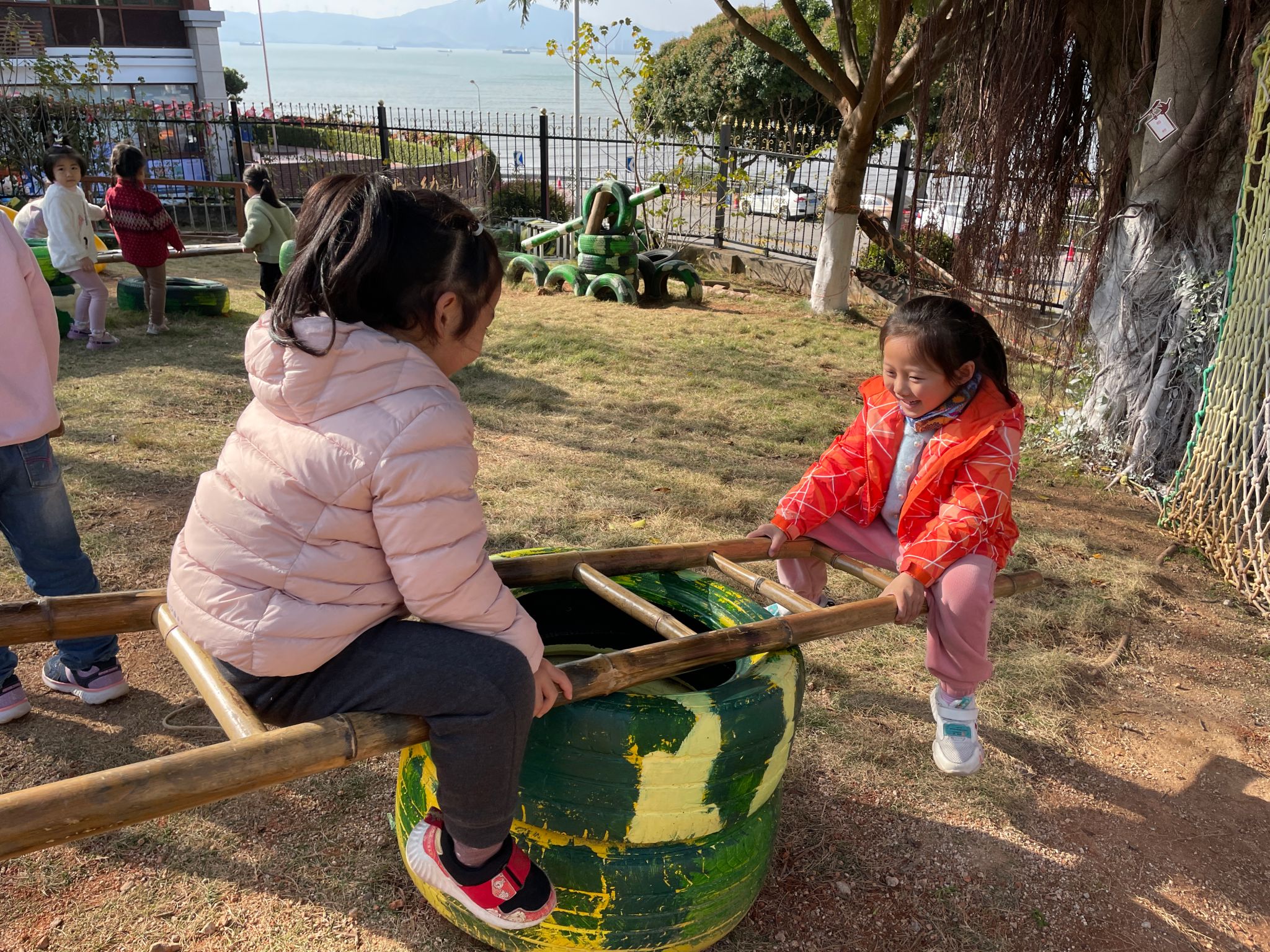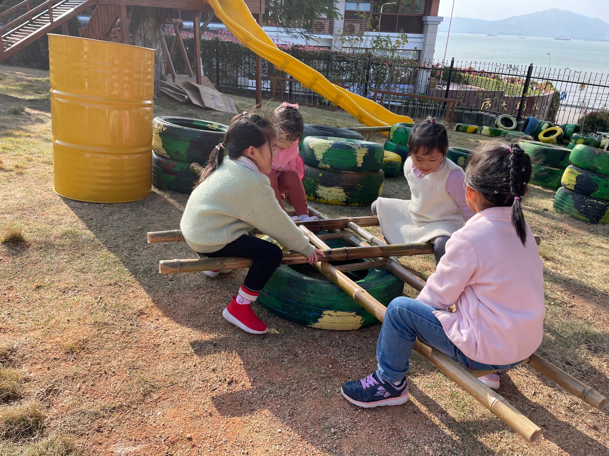 猜猜我们在干什么呢?对啦,就是跷跷板,一开始我们还没有找到平衡和技巧需要老师的帮助,后来,我们发现了轮胎的好用处,它帮我们固定住了梯子,我们还发明了四人版本的跷跷板,厉害吧。