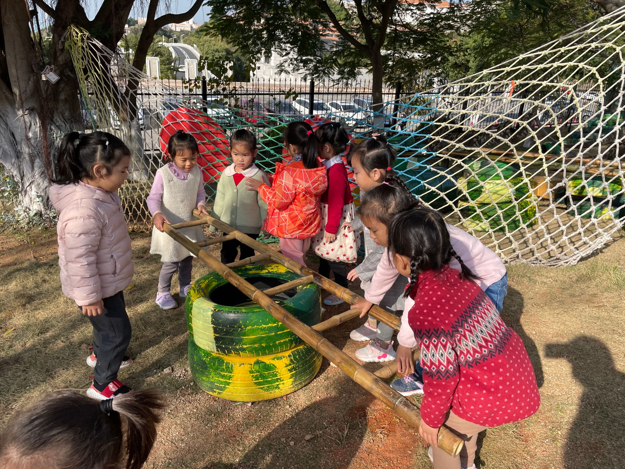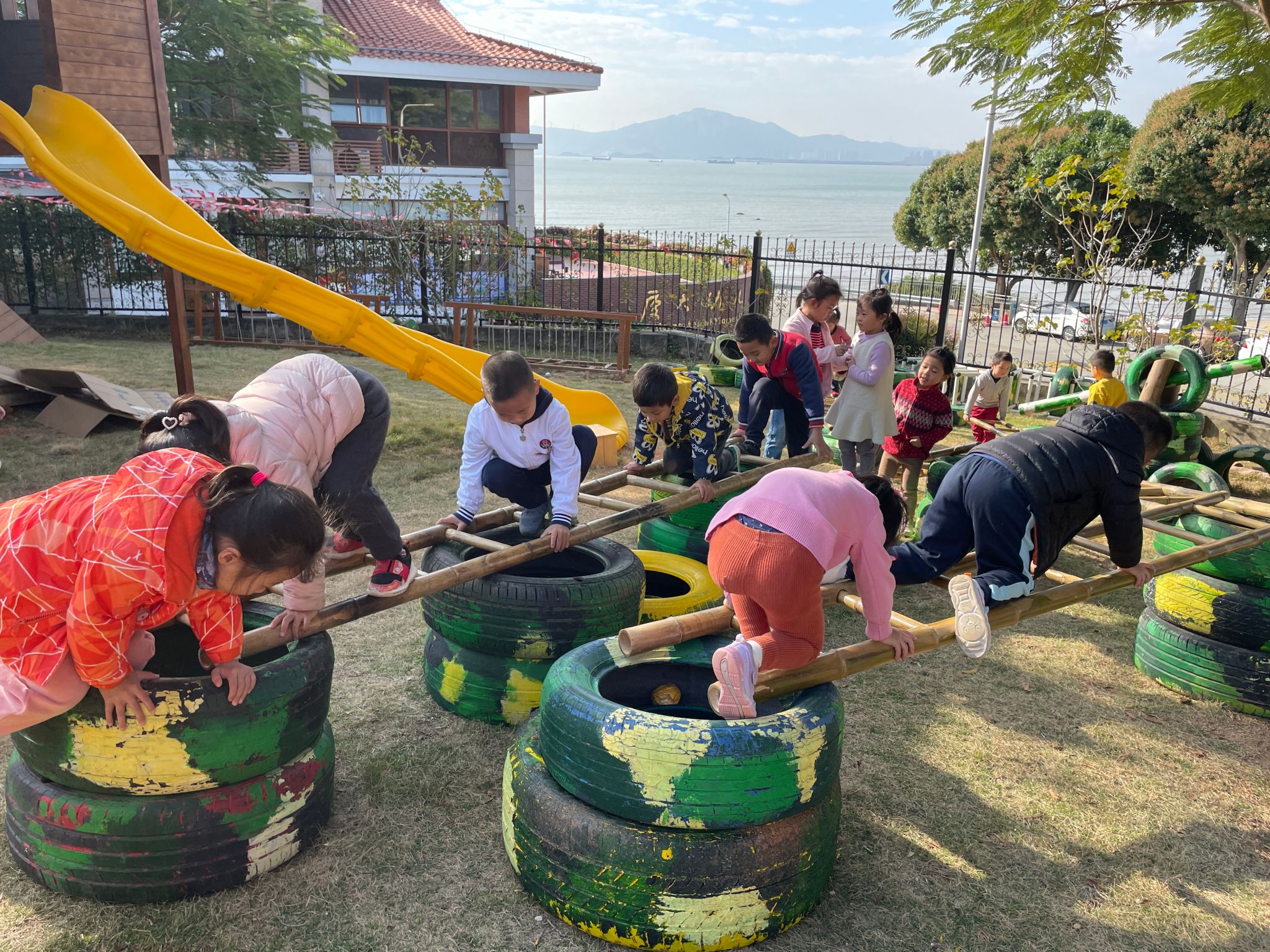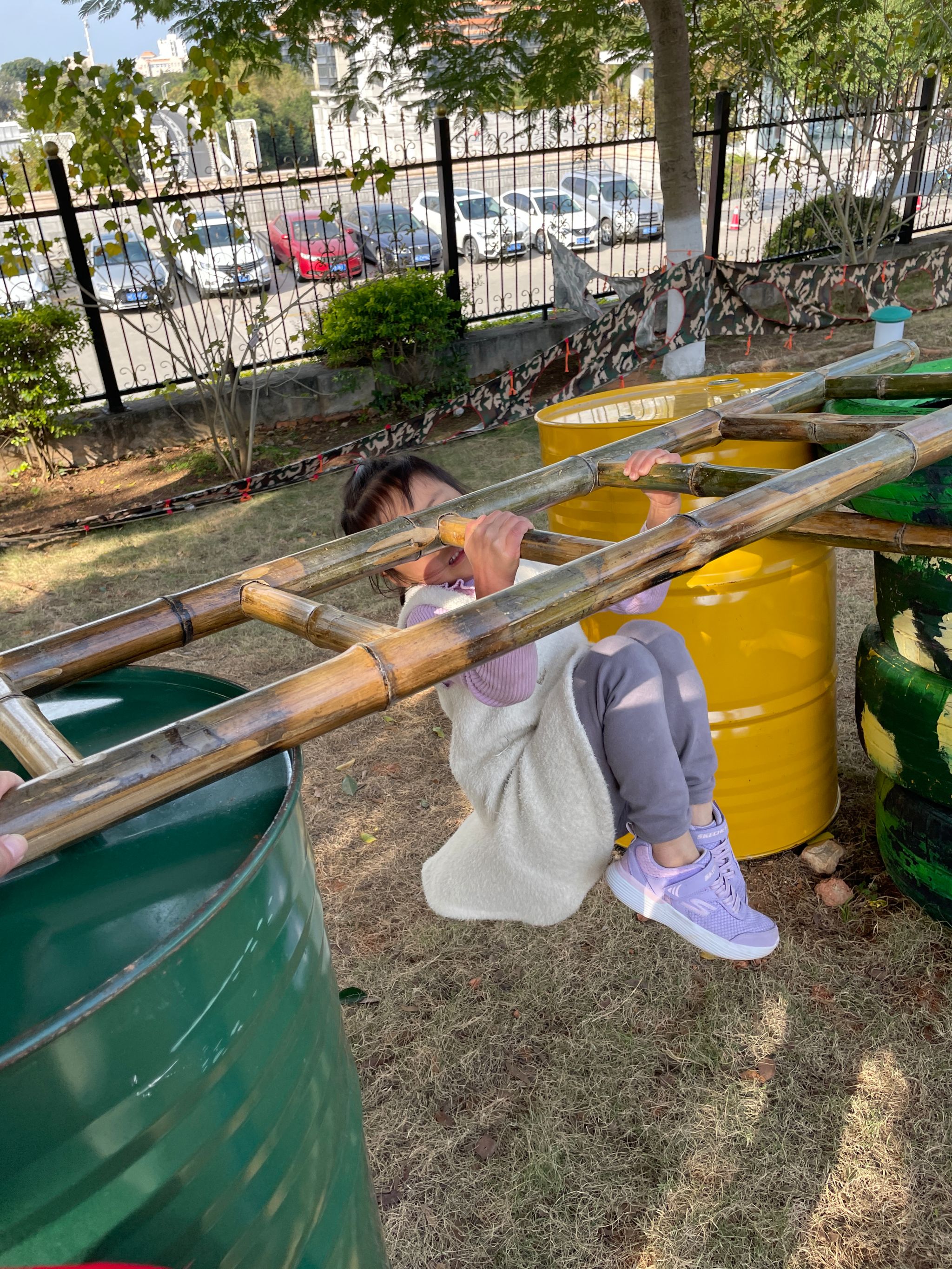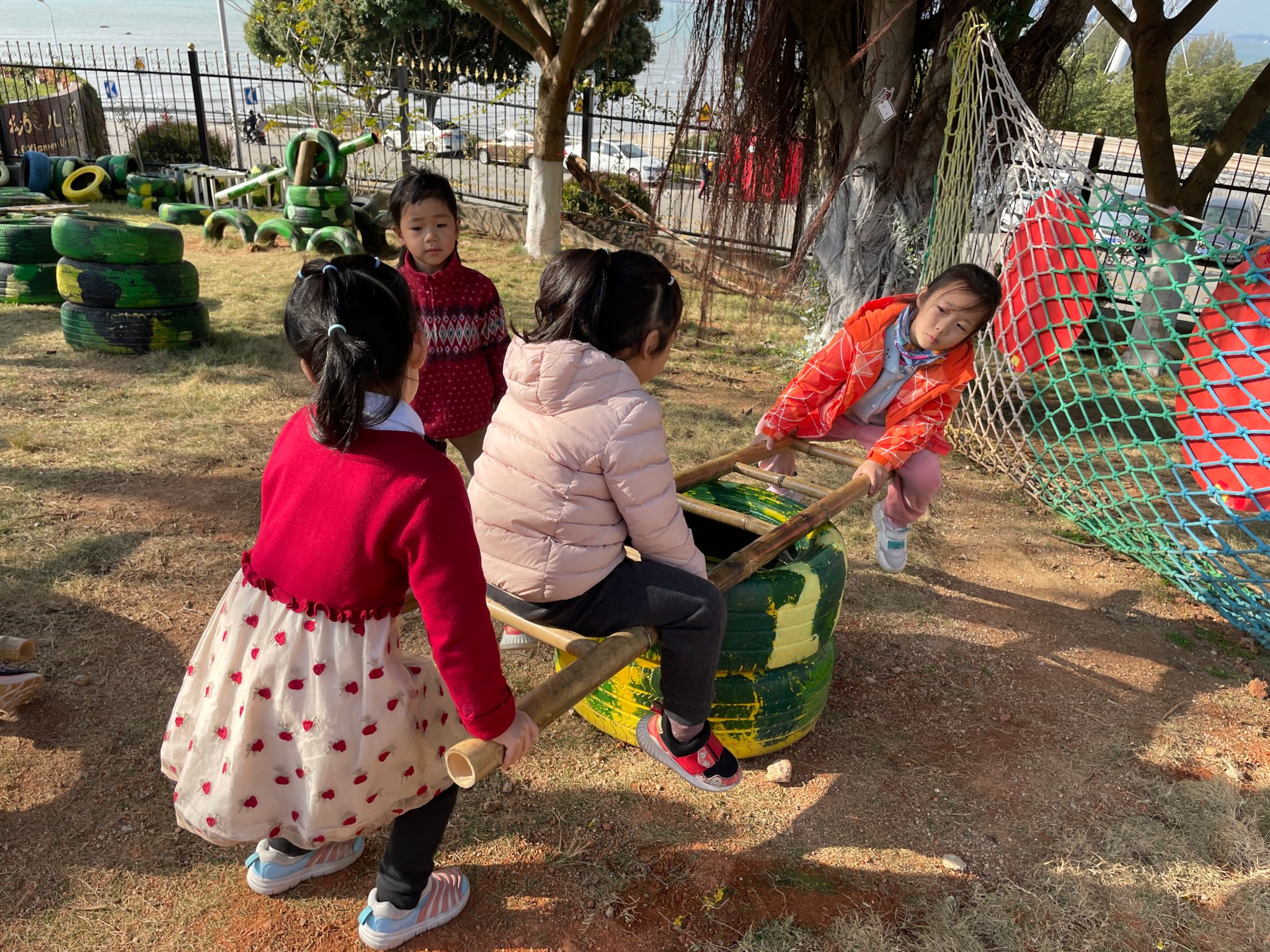 猜猜我们在干什么呢?对啦,就是跷跷板,一开始我们还没有找到平衡和技巧需要老师的帮助,后来,我们发现了轮胎的好用处,它帮我们固定住了梯子,我们还发明了四人版本的跷跷板,厉害吧。