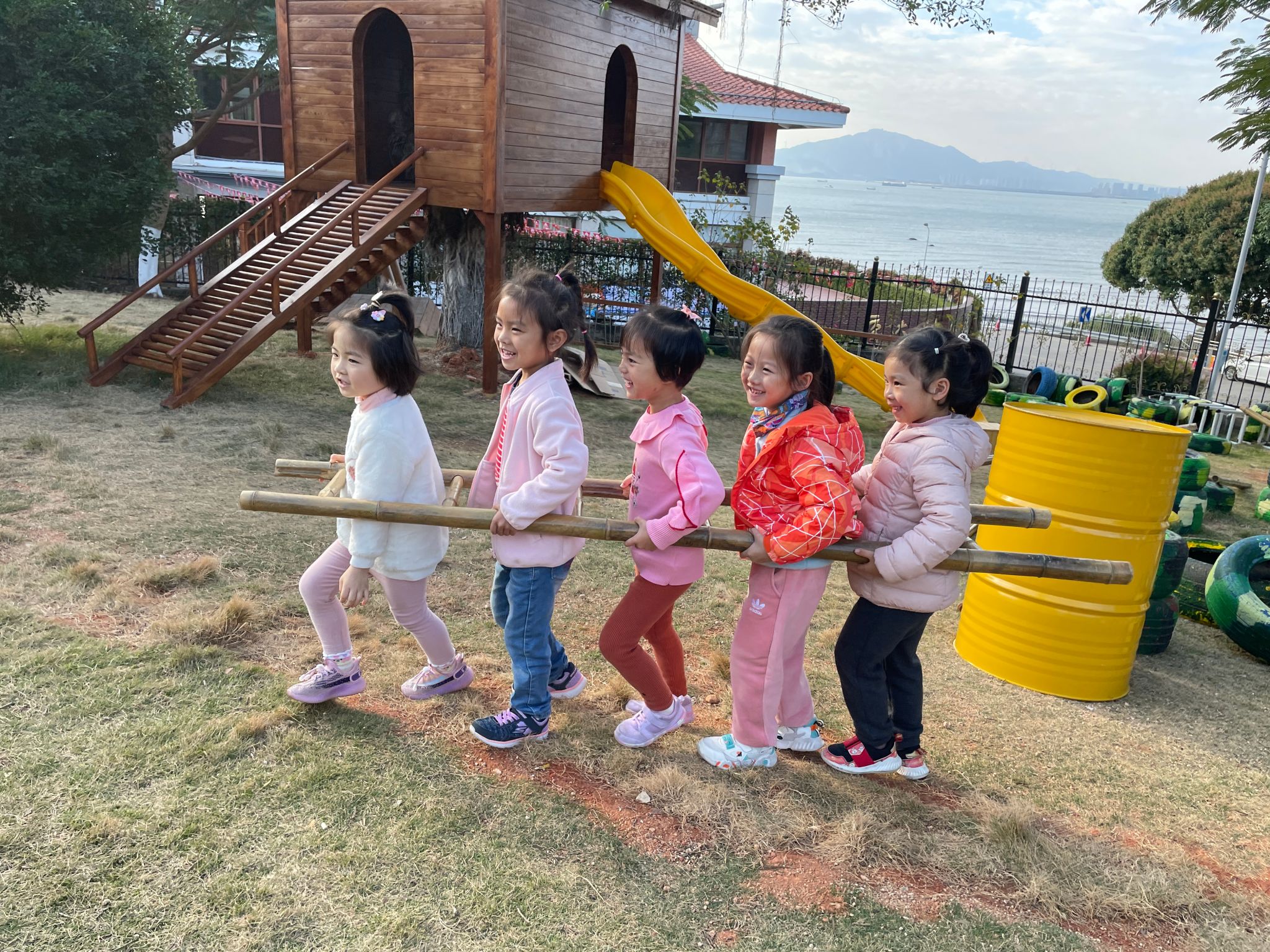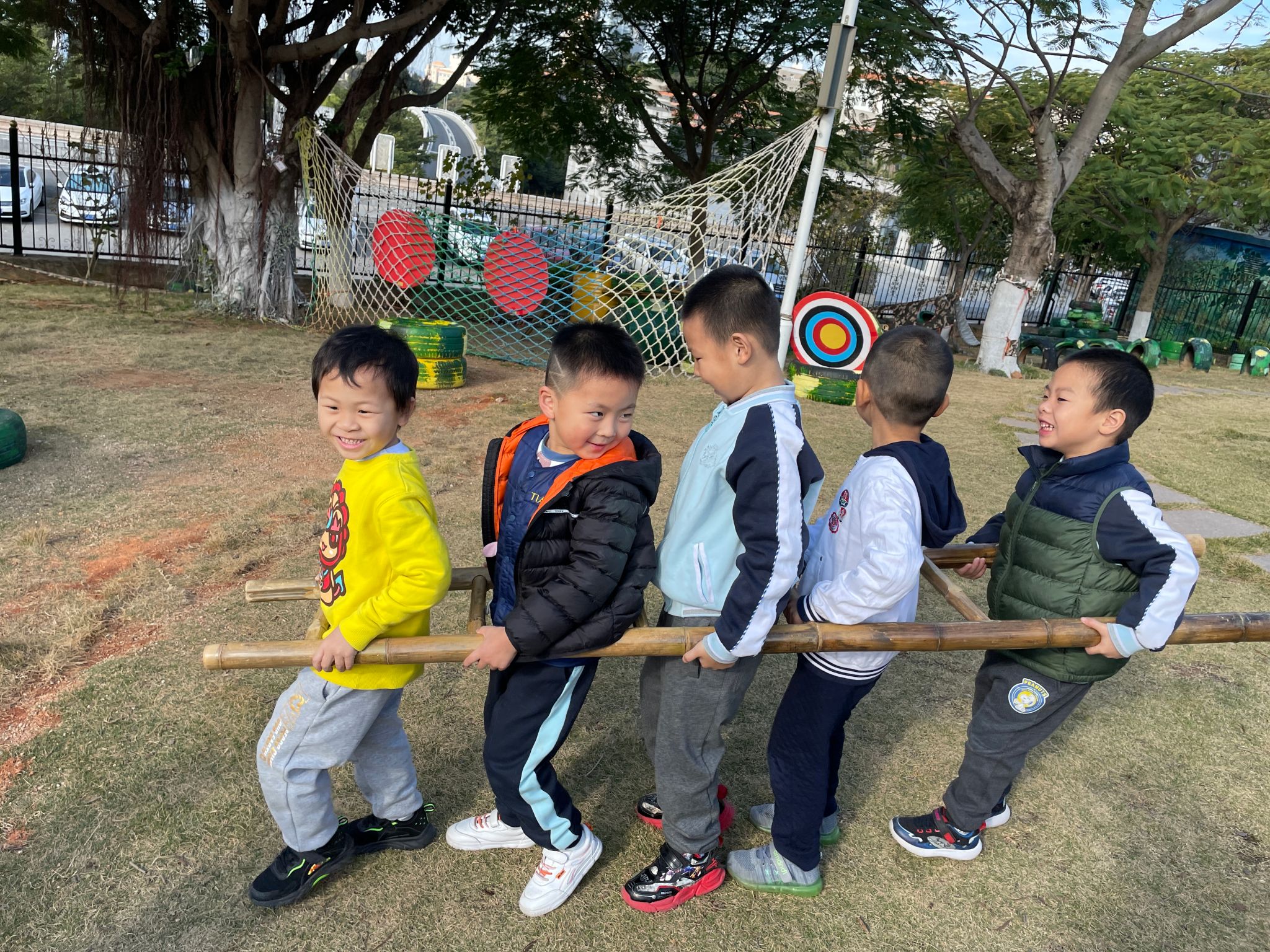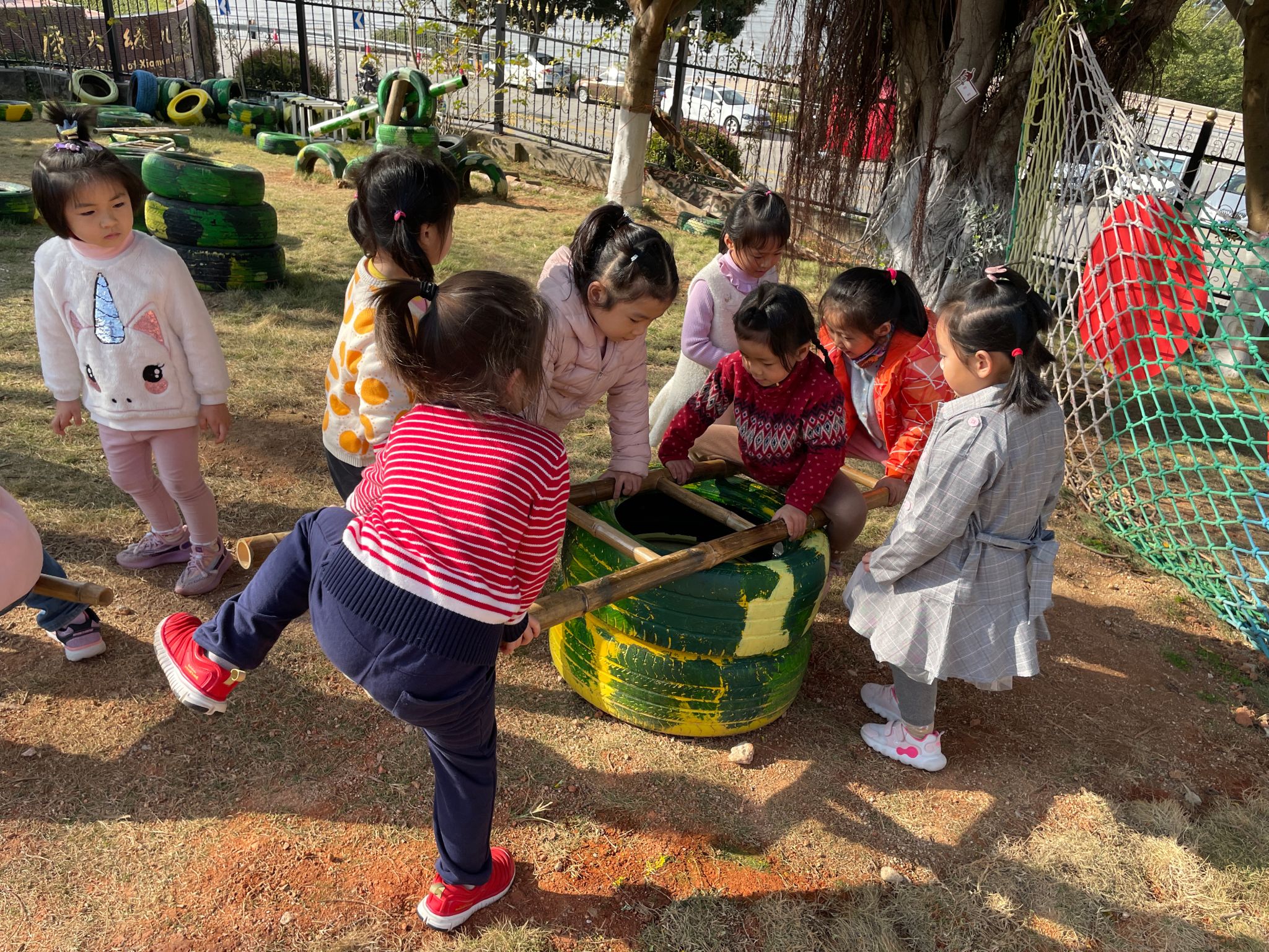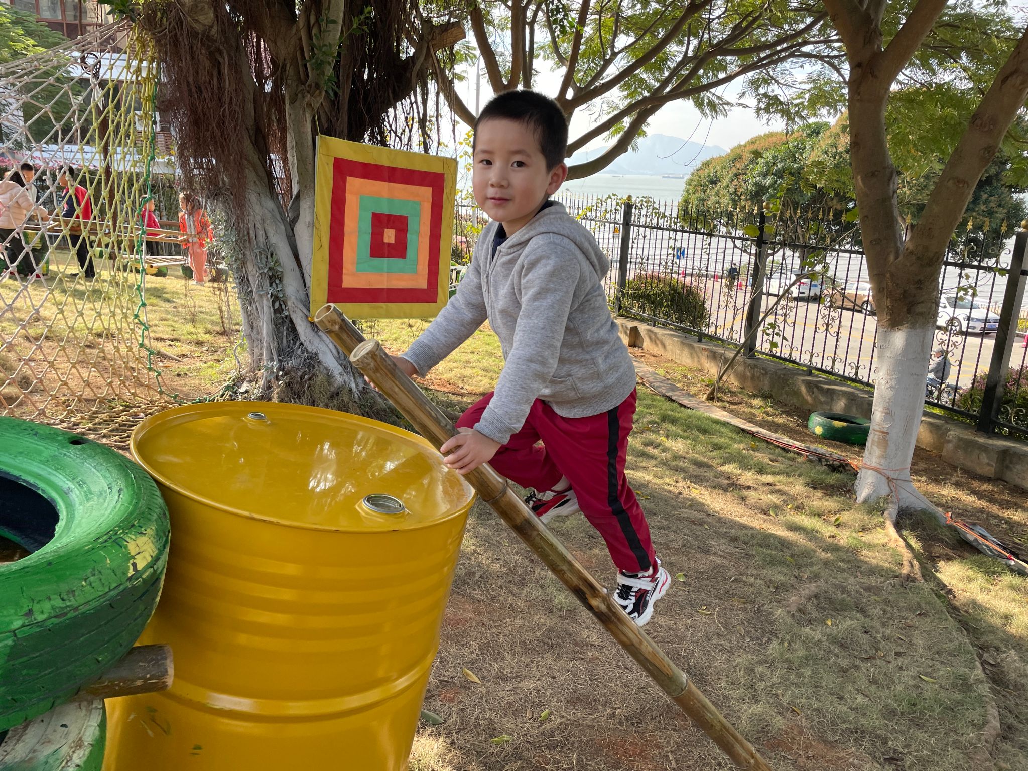 猜猜我们在干什么呢?对啦,就是跷跷板,一开始我们还没有找到平衡和技巧需要老师的帮助,后来,我们发现了轮胎的好用处,它帮我们固定住了梯子,我们还发明了四人版本的跷跷板,厉害吧。