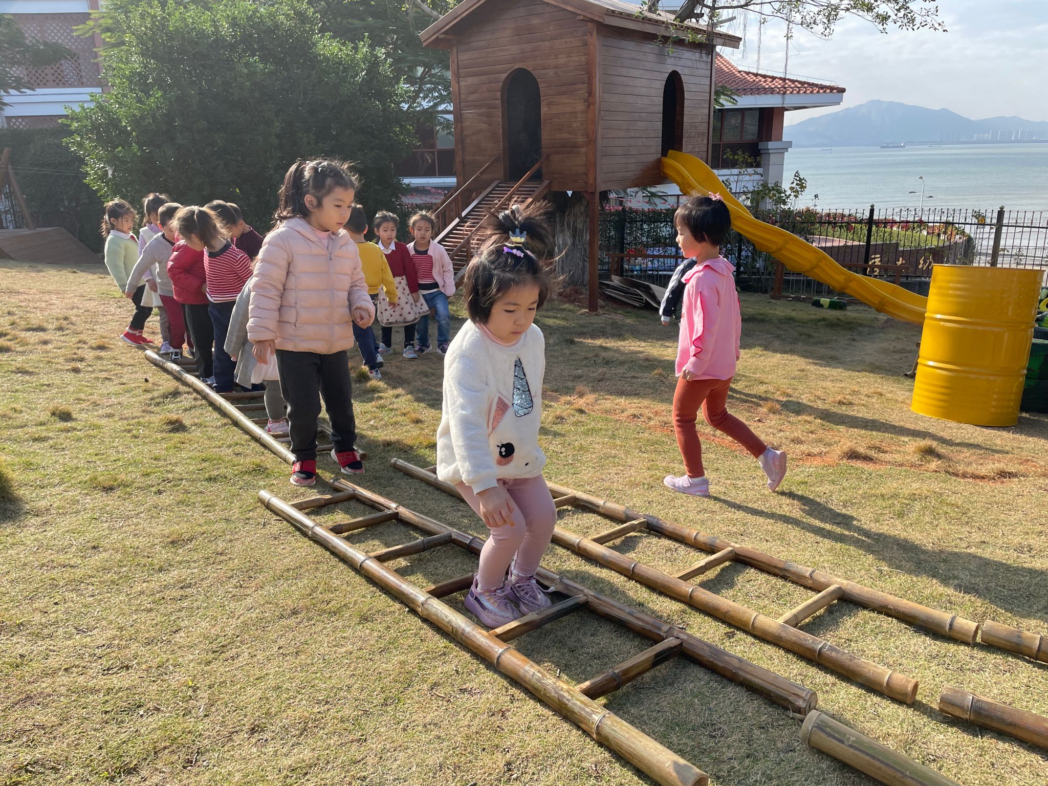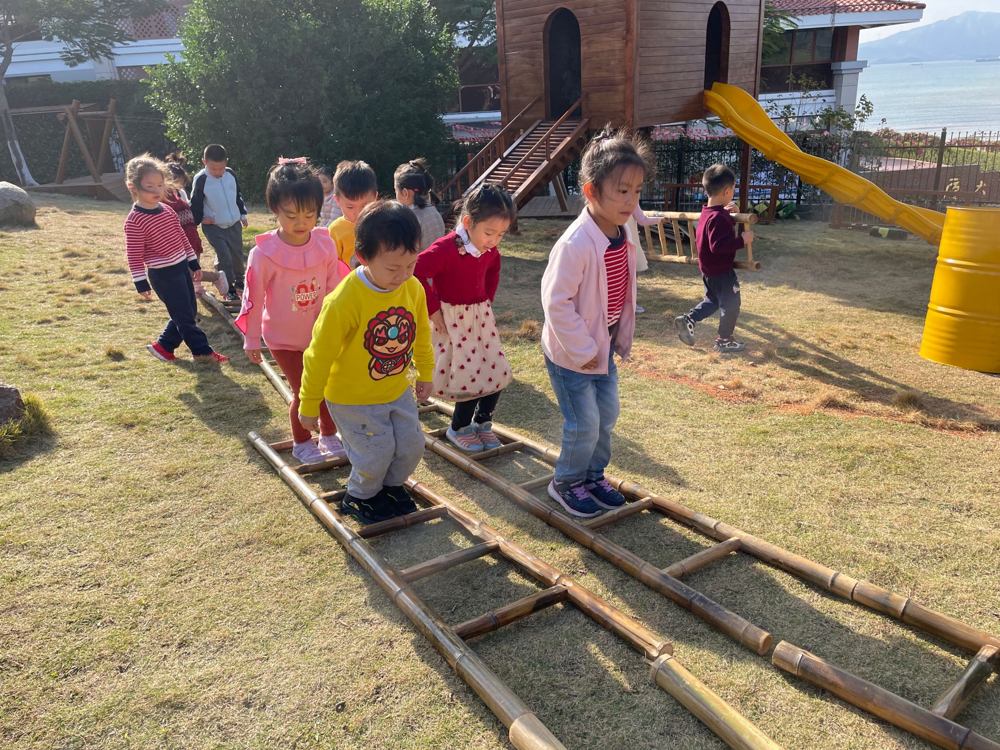 看呀!放倒的梯子还能跳房子呢!我们像小白兔蹦蹦跳跳!跳房子还要排好队哦!