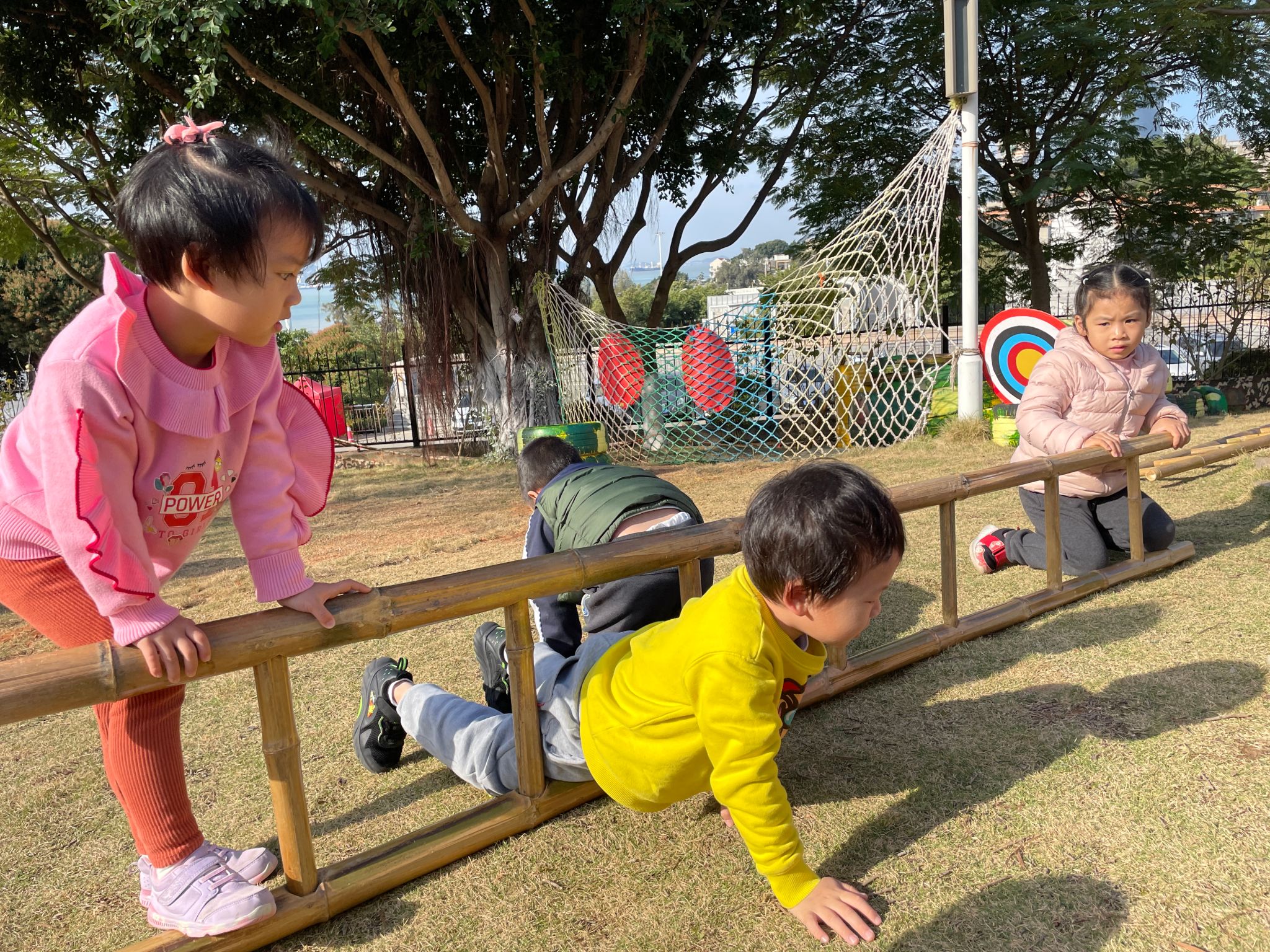 梯子还能变成小山洞,看我们灵巧的身体,一下子就钻过去了。
