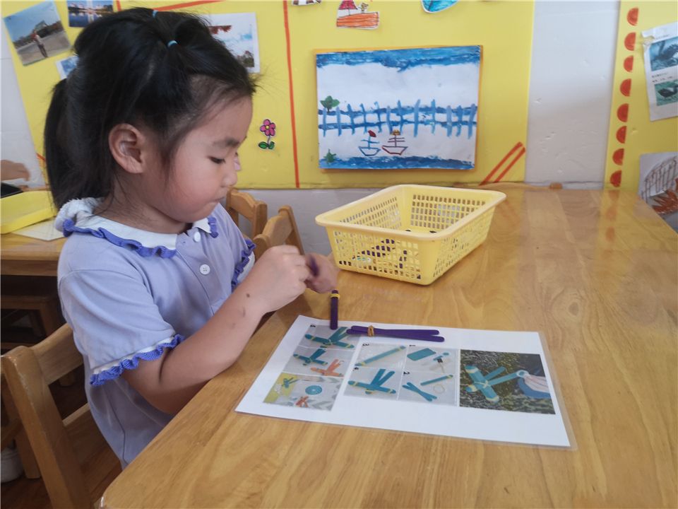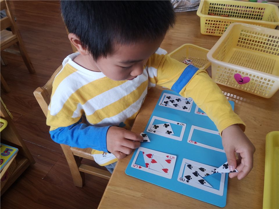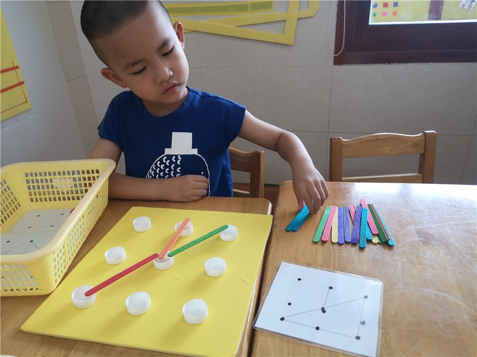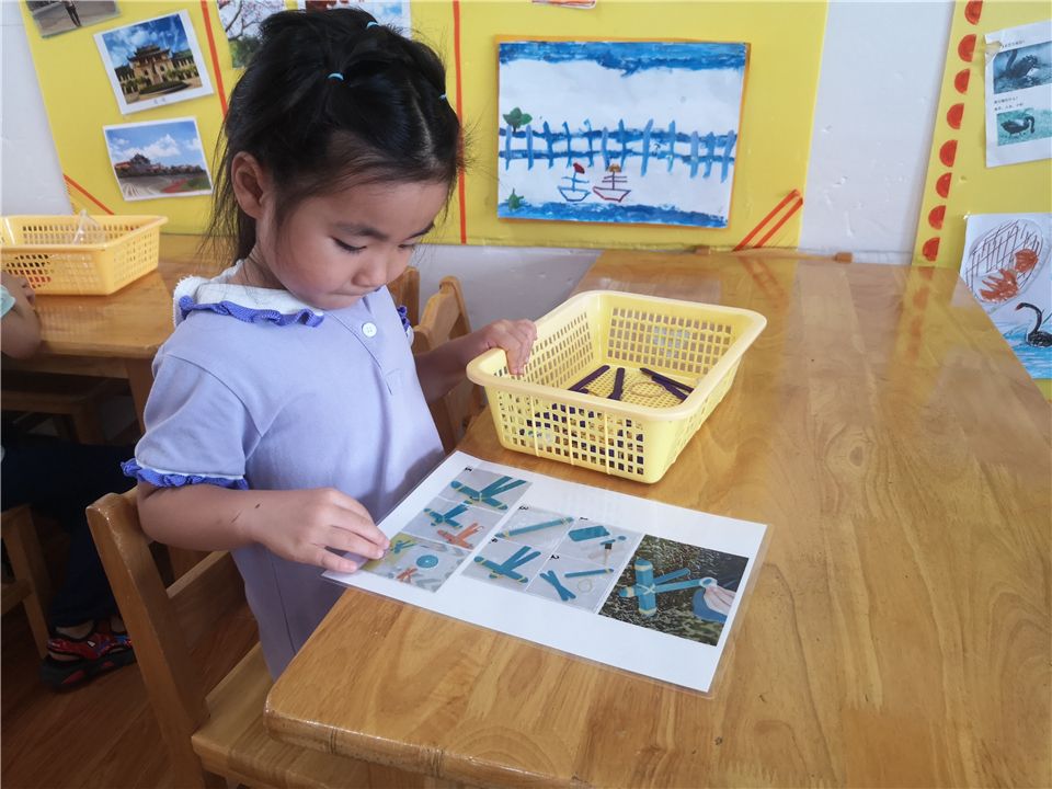 乐乐小朋友正在试着摆出学习卡上的图案。