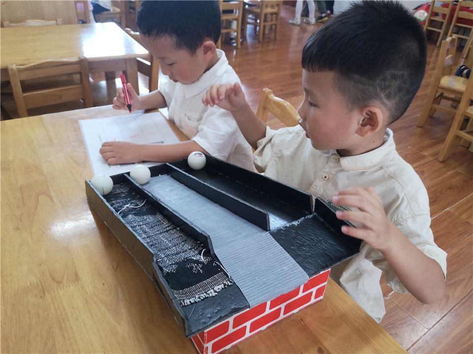 这两个小朋友正在研究哪个小球滚得最快,他们一个在实验,一个负责记录。