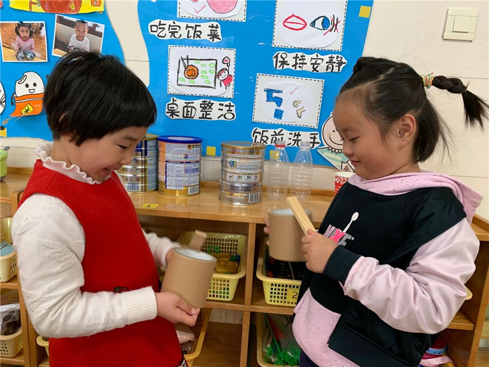 我们和孩子开始讨论哪些东西敲击的声音更像乐器发出的声音,带着这个问题孩子们开始寻找,恩奇敲击玻璃瓶发出了木琴的声音、沫伊用木棍敲击竹筒发出了木鱼的声音、怀萱用手拍打奶粉罐发出了鼓的声音。孩子们发现只有一小部分的东西能够发出和乐器相似的声音,但开展音乐会需要的乐器却很多。于是我们便让孩子回去和爸爸妈妈一起寻找更多在敲击中能发出和乐器相似声音的物品。在家长的帮助下,孩子们纷纷把“乐器”带来幼儿园分享,装着沙子的瓶子通过摇晃能发出沙锤的声音、两个瓶盖相互碰撞能发出响板的声音、用铁棍敲击铁罐子能发出三角铁的声音,“乐器”不断在丰富,孩子们的兴致也随之高涨。几天后,属于班级的音乐会拉开了序幕。孩子们用上自己寻找的“乐器”演奏着乐曲,场面十分热闹!