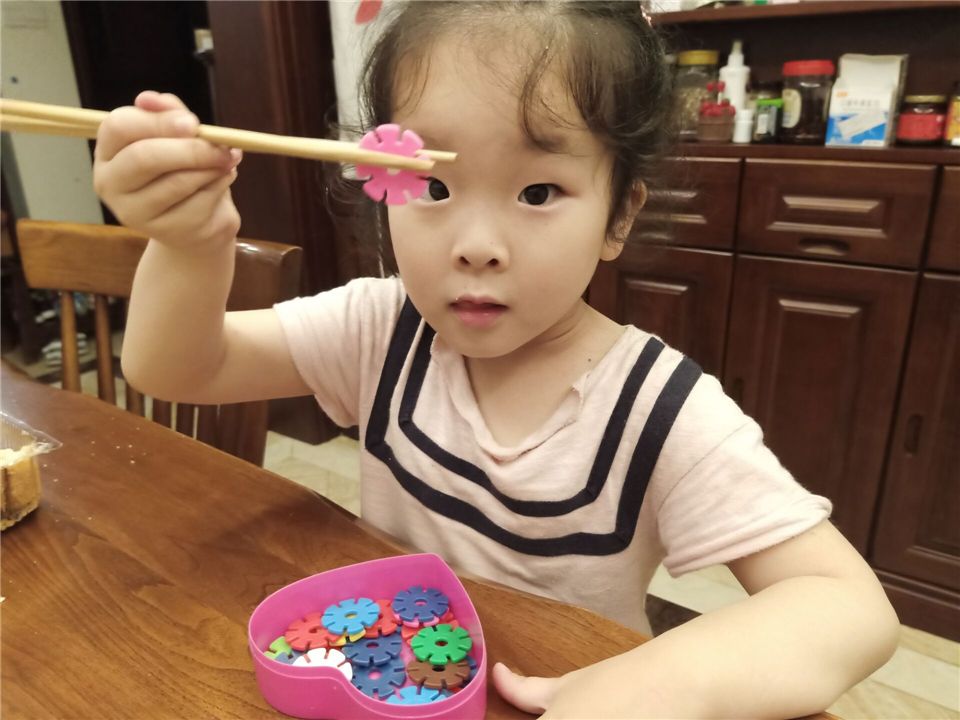 “我在用花片练习筷子,快看,我夹起来啦。”