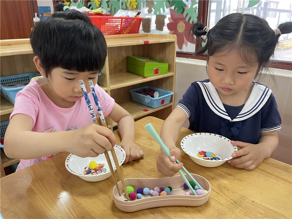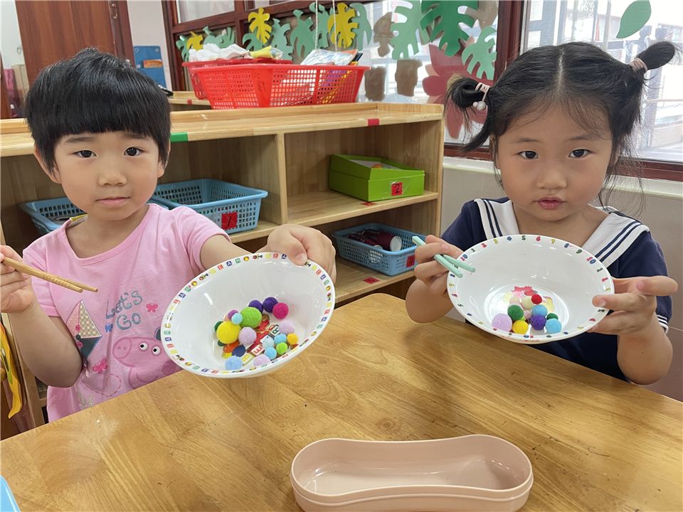而当它被投放在区域里,它则具有着夹、拨、挑、扒、撮、撒等多种功能。不信?你看!萌娃们正在花式玩“筷”!