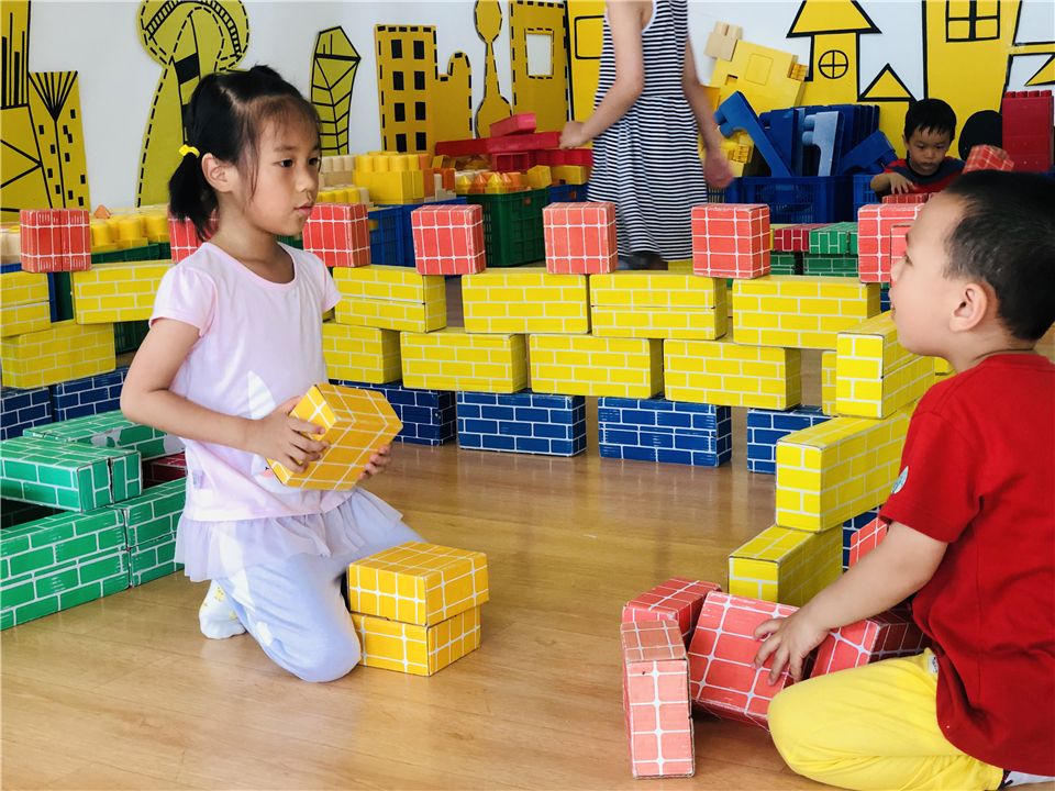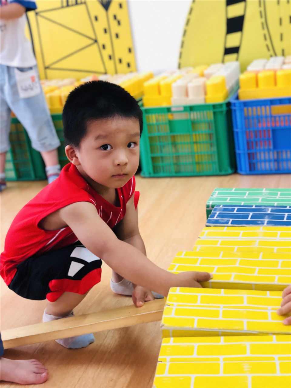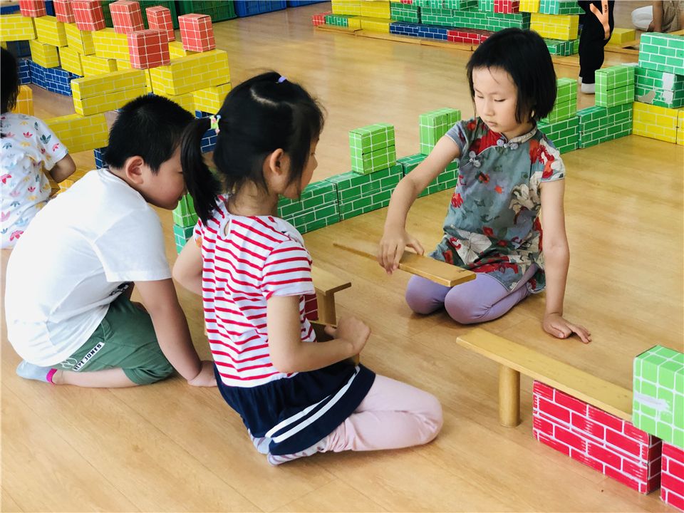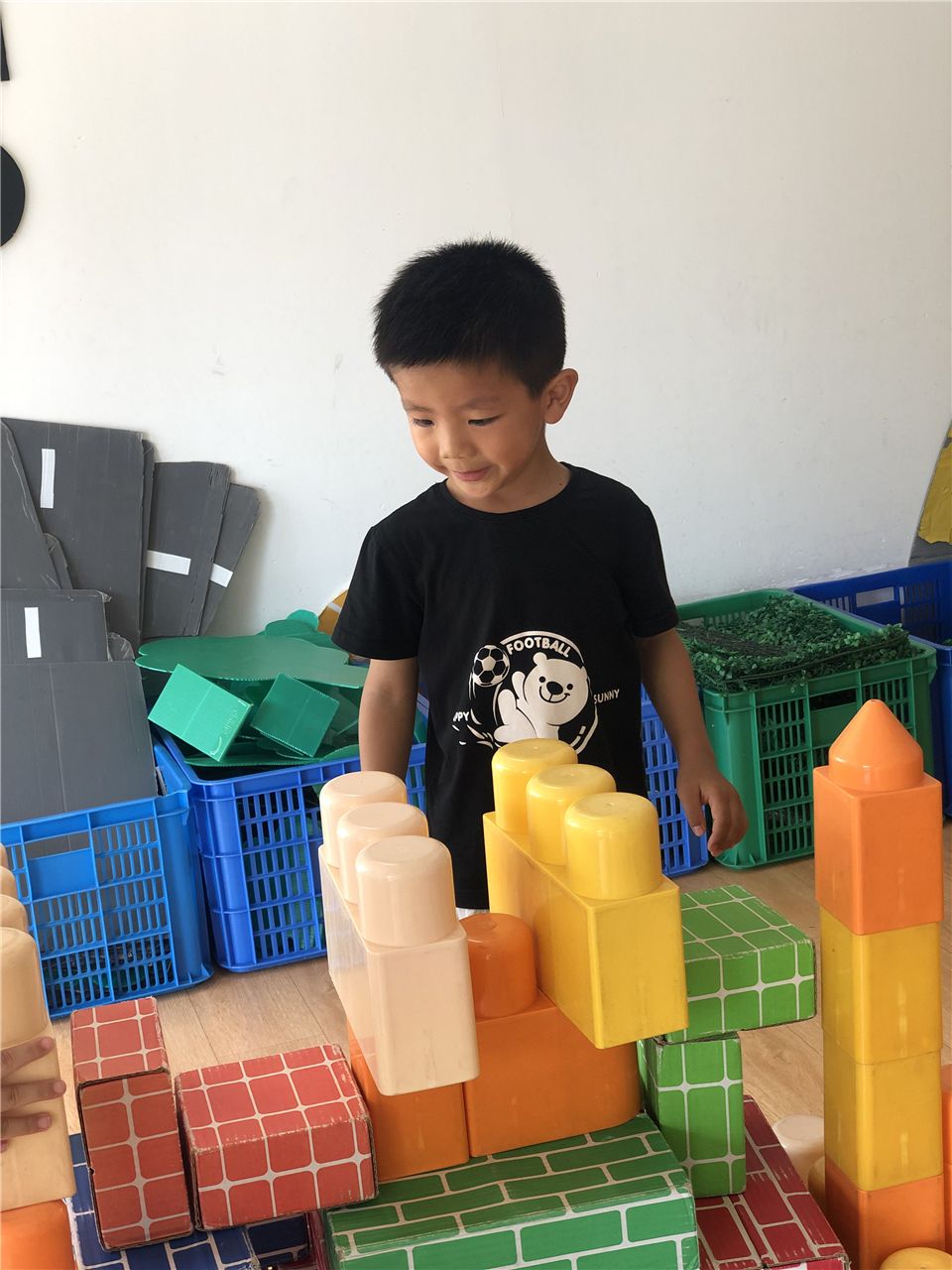 经过萌娃们不懈的努力,火车站已经像模像样了,萌娃们坐在边上愉快地欣赏着自己的作品。