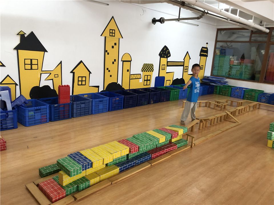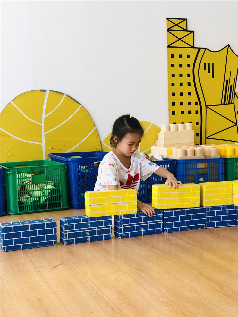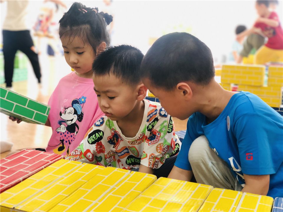 萌娃们有的在给火车站做漂亮的屋顶装饰,有的在做间隔的的墙面,都在用不同的材料进行创意拼搭。