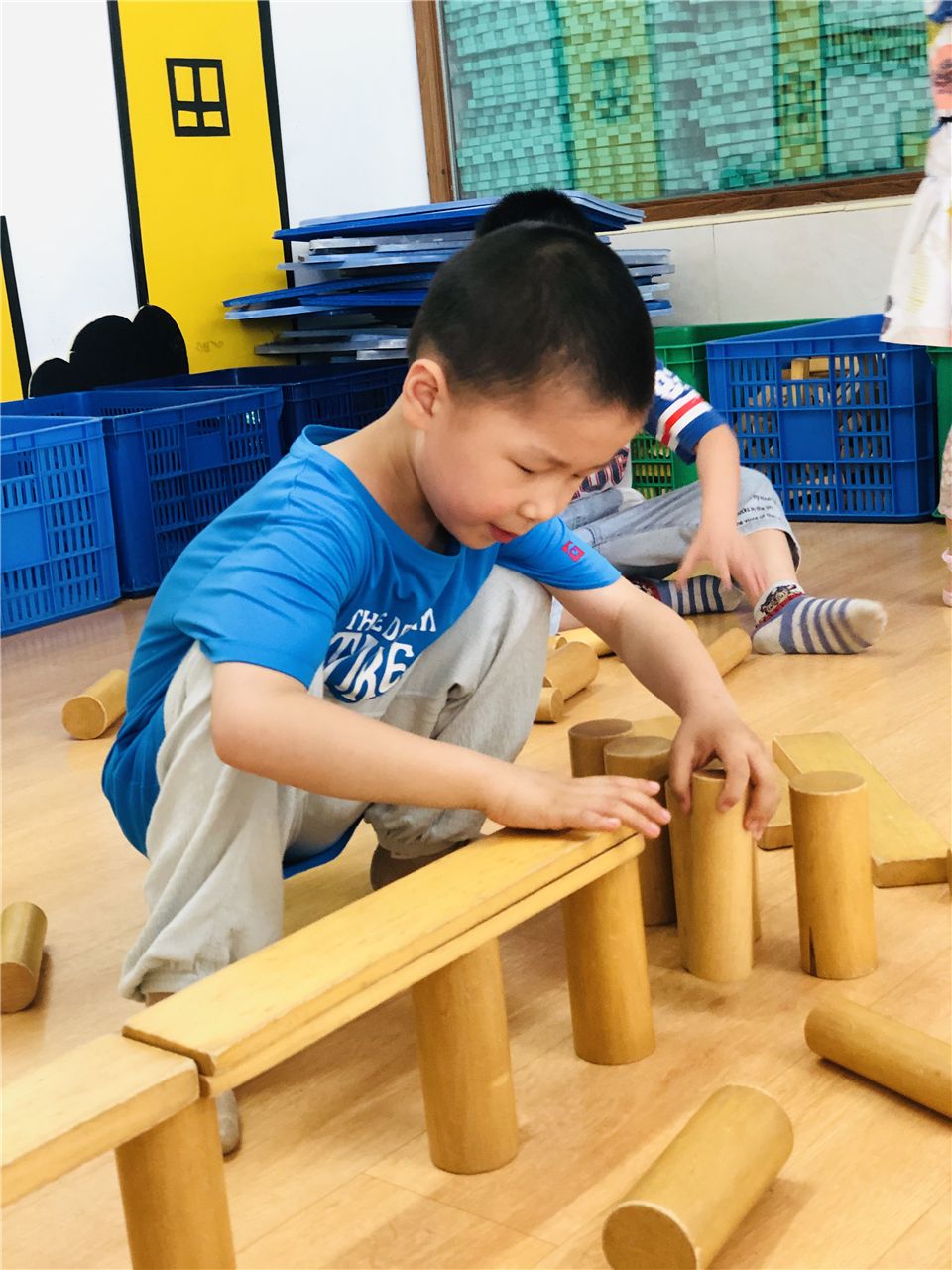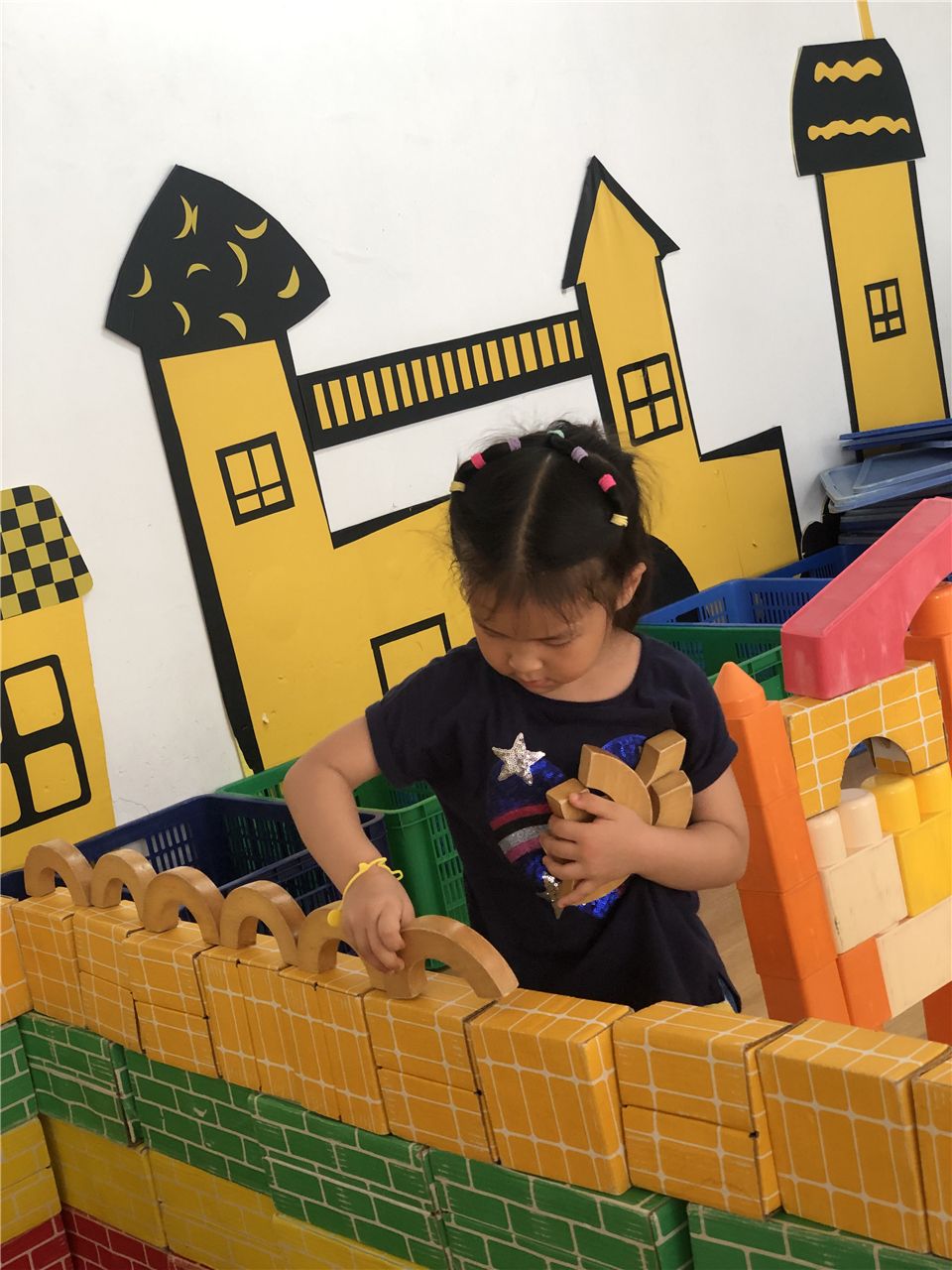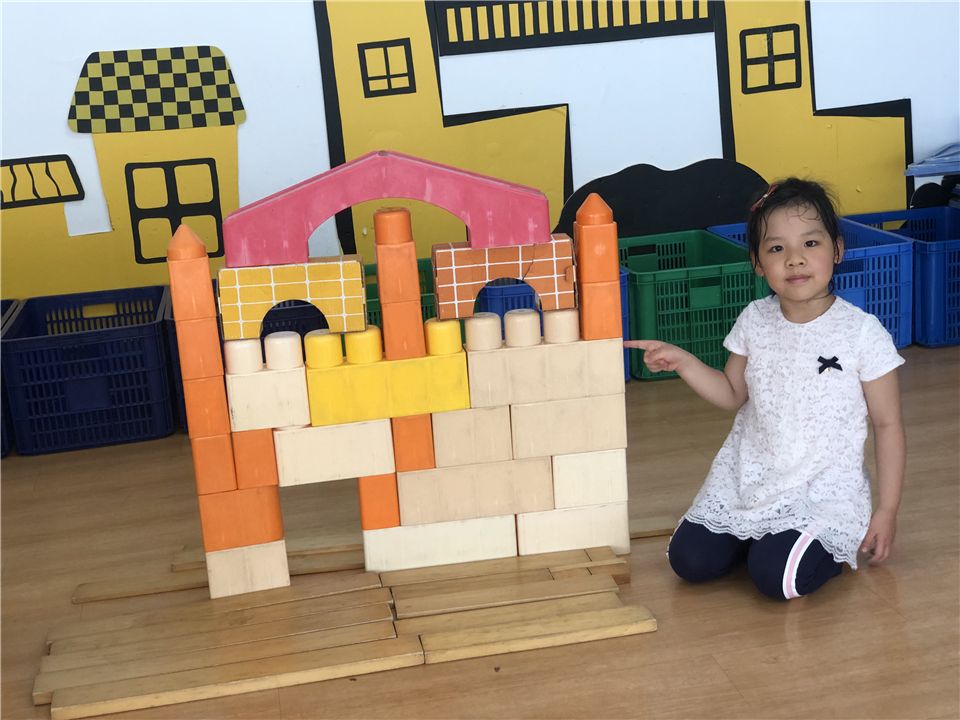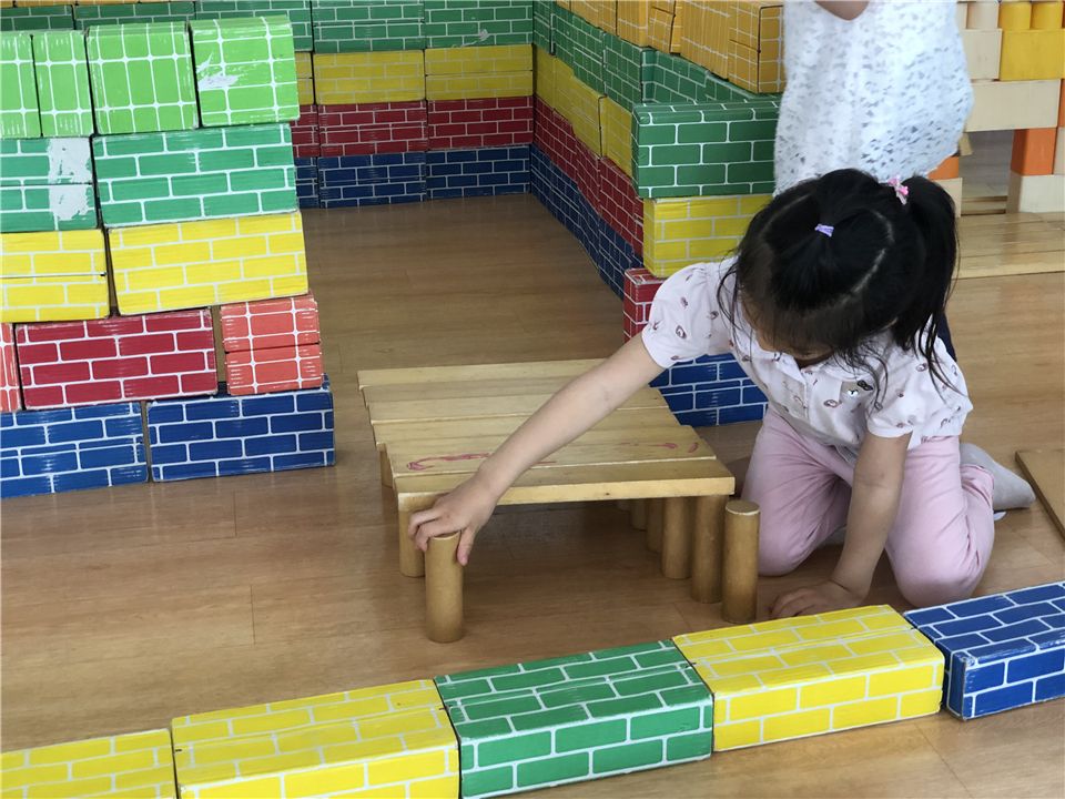 奕晗刚开始一个人在搭建搭建着火车站的门,她尝试着木片横的竖的放,发现的效果都不好,门还是非常的不稳。