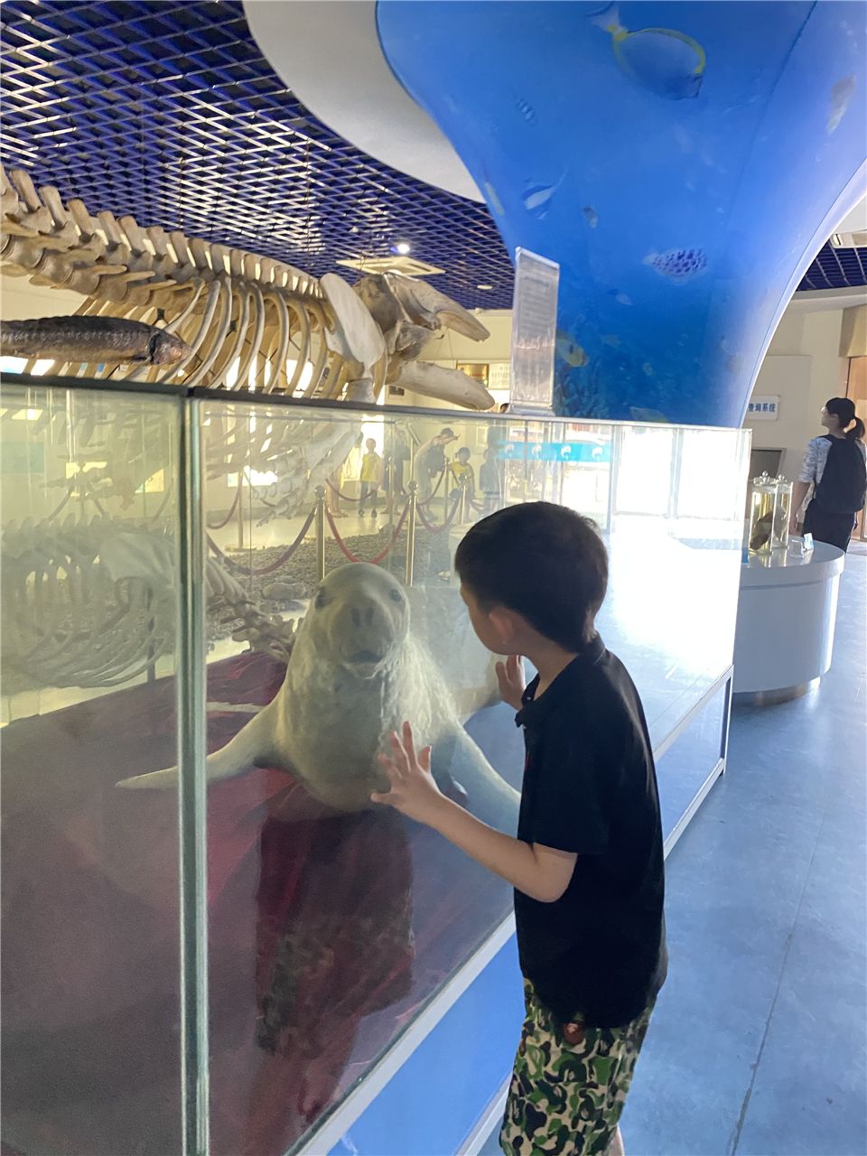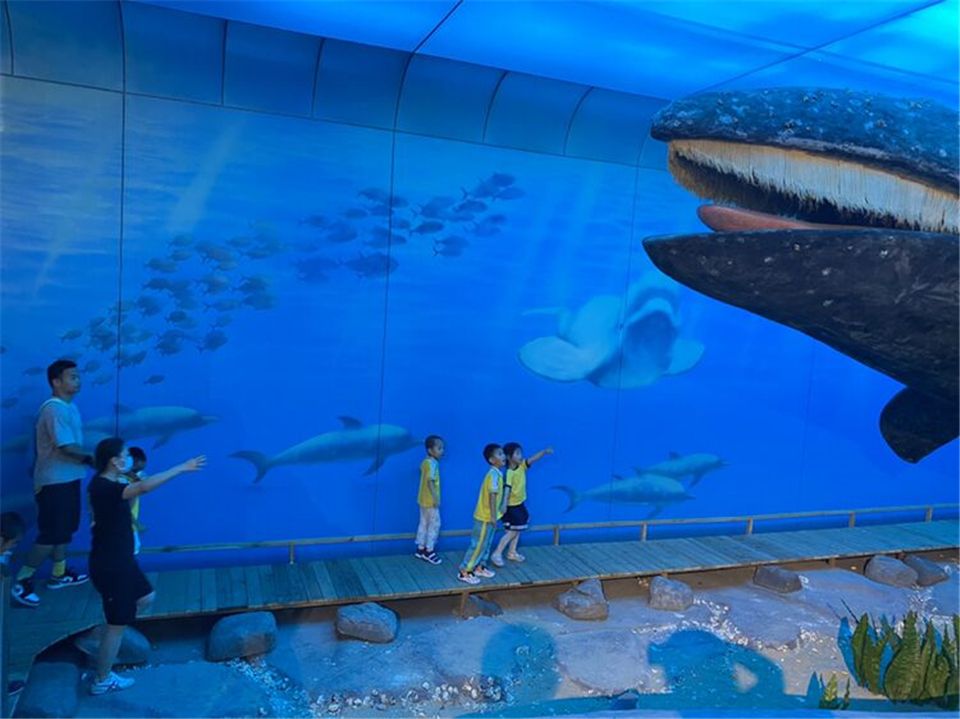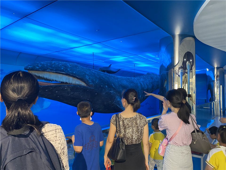 “鲸豚展馆”是我们参观的第一站,它是我国第一家以灰鲸为主题的海洋生物展馆。其中展示了我国保存最为完整的灰鲸标本,同时还展出了我国不同海域的各类海洋生物标本或样品两百多件 “鲸豚展馆”向小朋友们呈现了海洋生物的原始风貌,让小朋友们近距离的感受了海洋生物的神奇与魅力,增进小朋友们对海洋及海洋生物的保护意识。