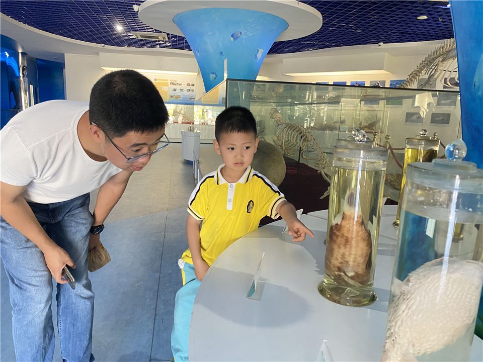 海洋三所的哥哥姐姐们化身小导游,带领着孩子们观察各种海洋生物标本、了解海洋生物知识。孩子们则展开想象的翅膀,畅想各自心目中海洋的样子。