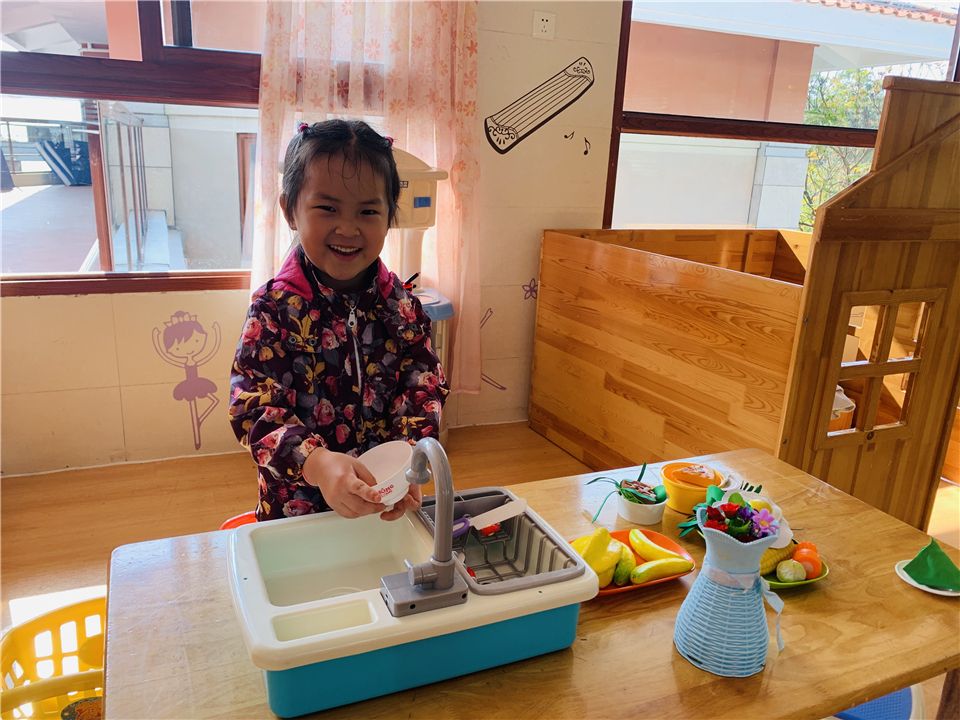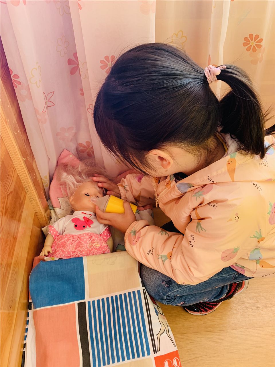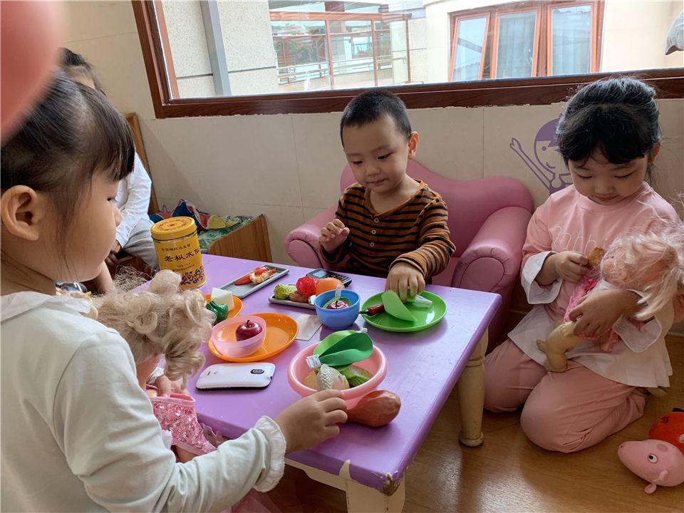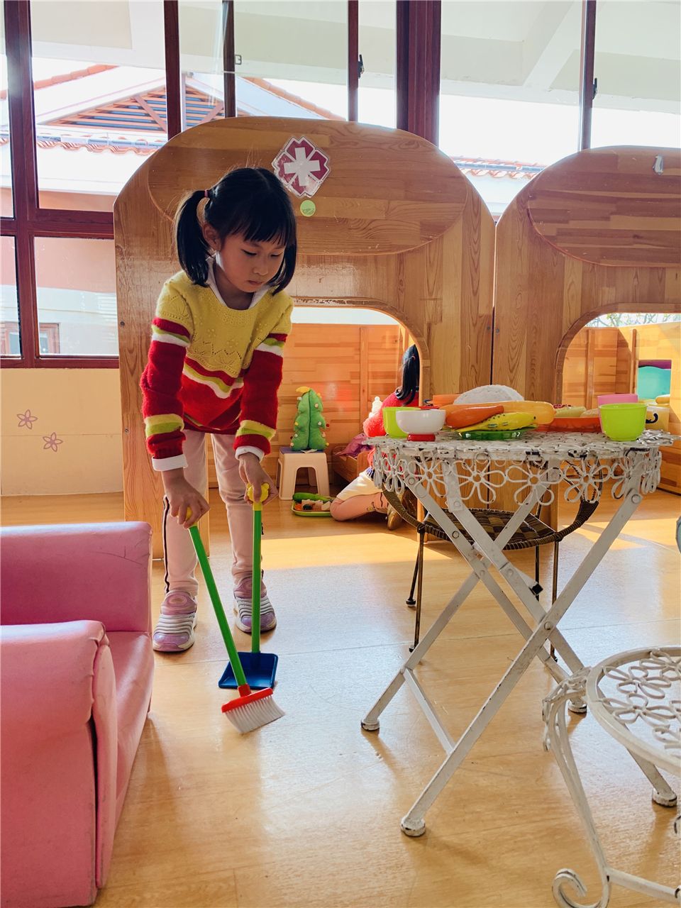 娃娃家里,“爸爸妈妈”们经过协商,有的做饭、有的打扫屋子、有的买菜....一个个象模象样的呢!