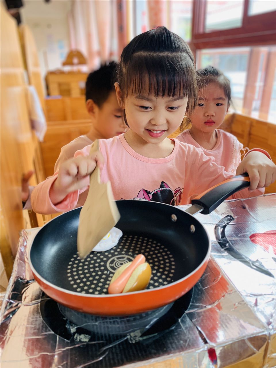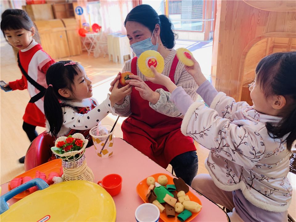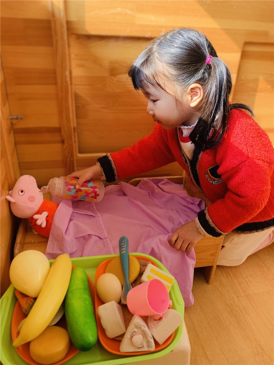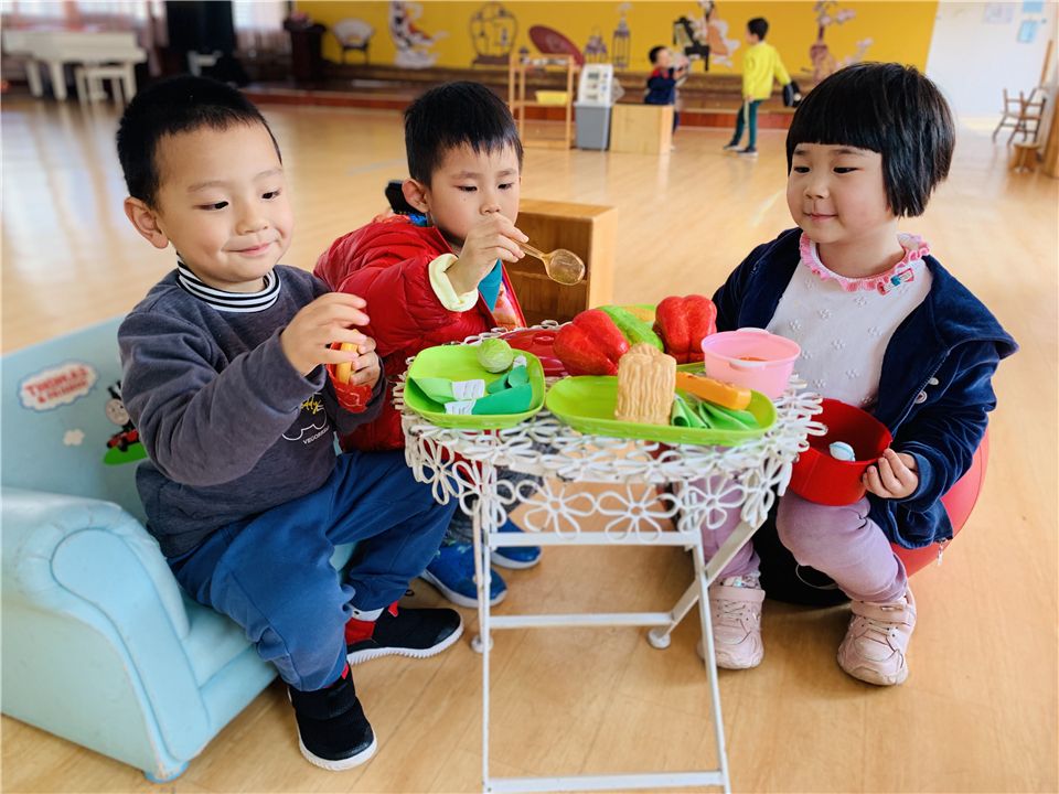 娃娃家里,“爸爸妈妈”们经过协商,有的做饭、有的打扫屋子、有的买菜....一个个象模象样的呢!