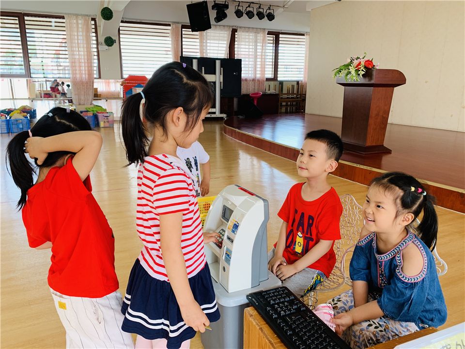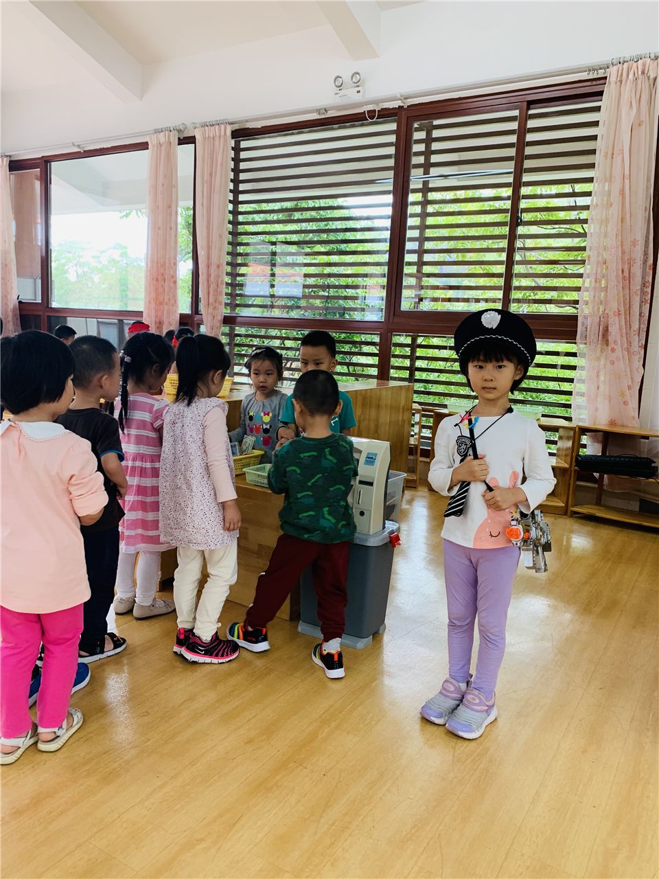 银行里的工作人员,正在严肃认真、有条不紊地进行取款服务:刷卡、输密码、取钱.....门口的持枪“保安”有序地组织着排队的队伍,爸爸妈妈你们说我们模仿得像不像呀?
