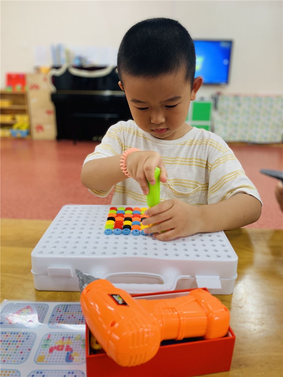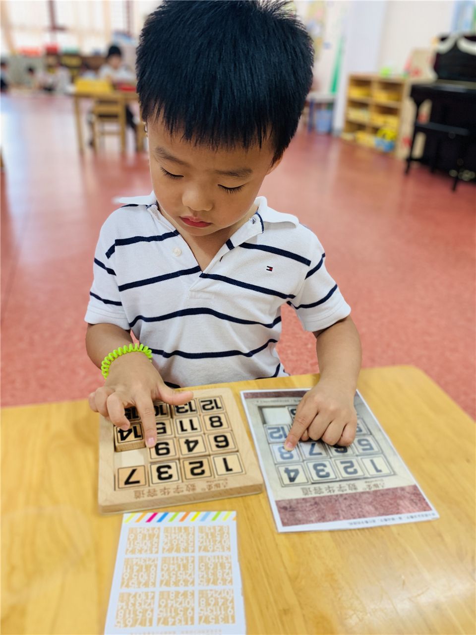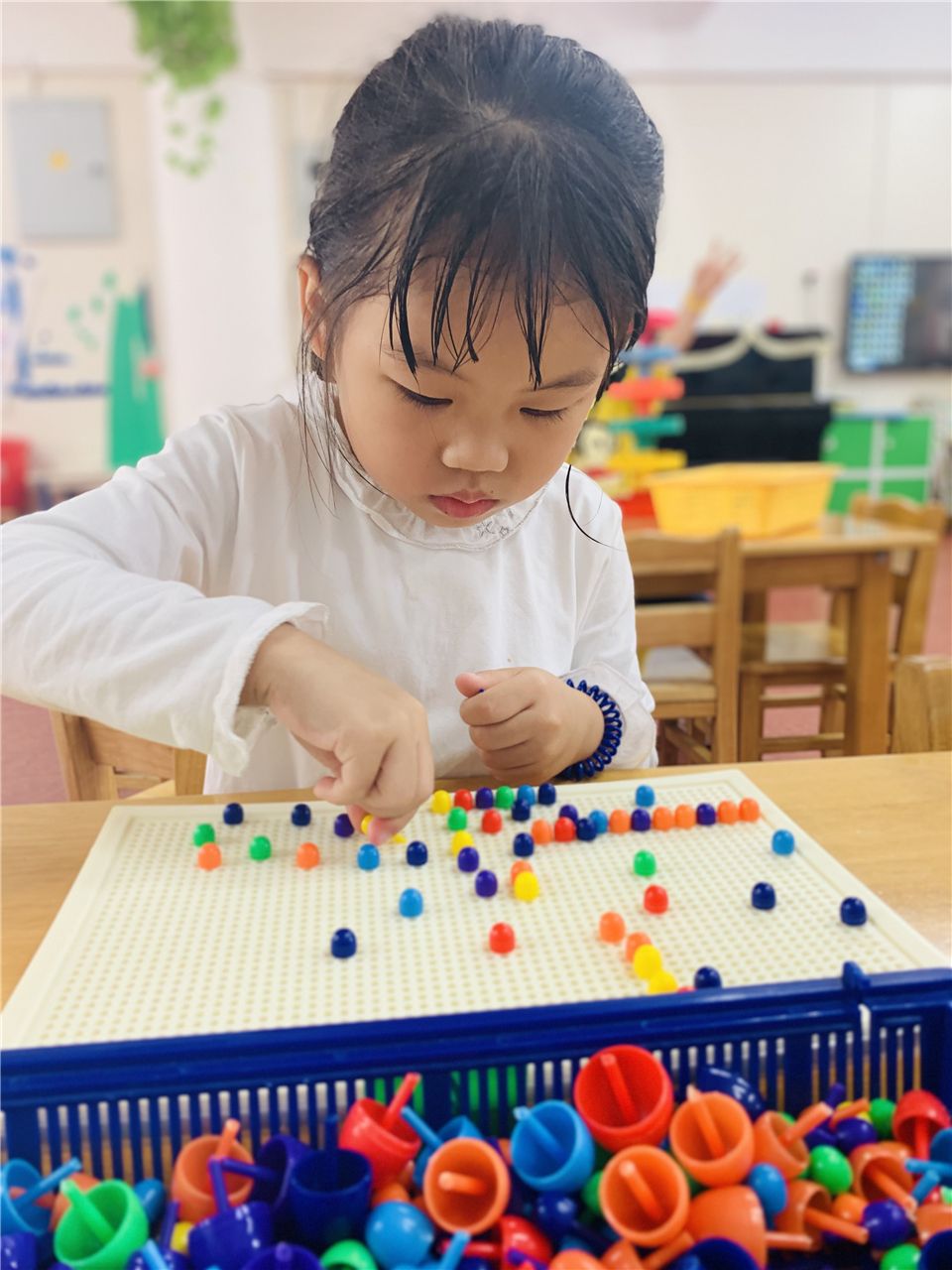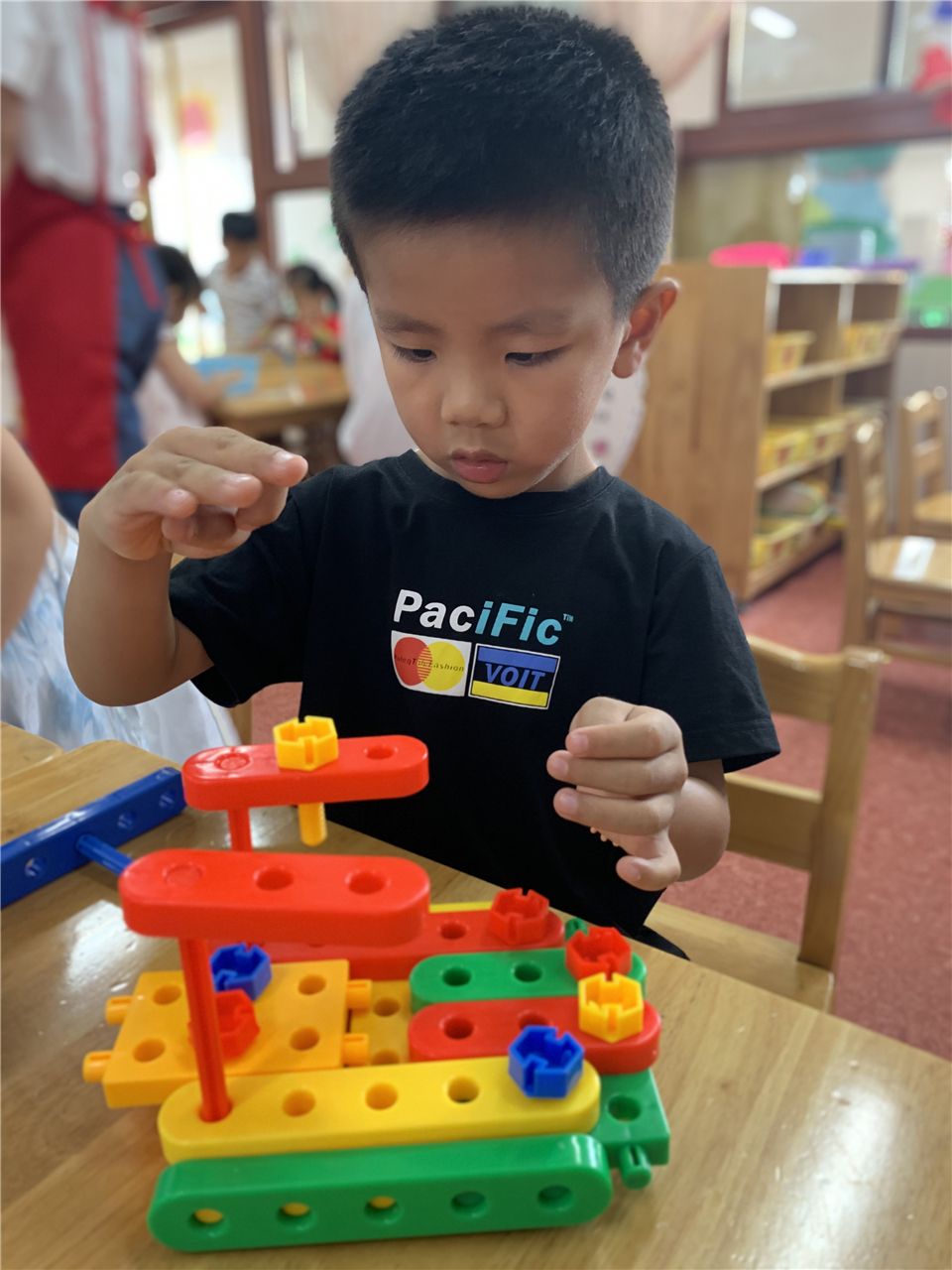 益智区里的操作材料,可是要经过一番思索的哟!这也难不倒我们中三班的萌娃,他们倆倆合作,一起动脑经完成任务。