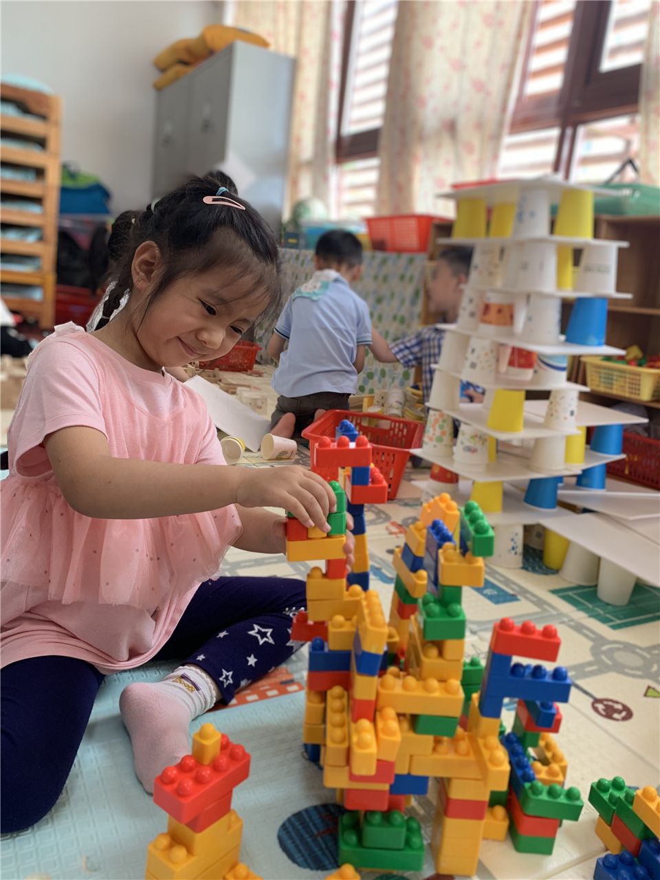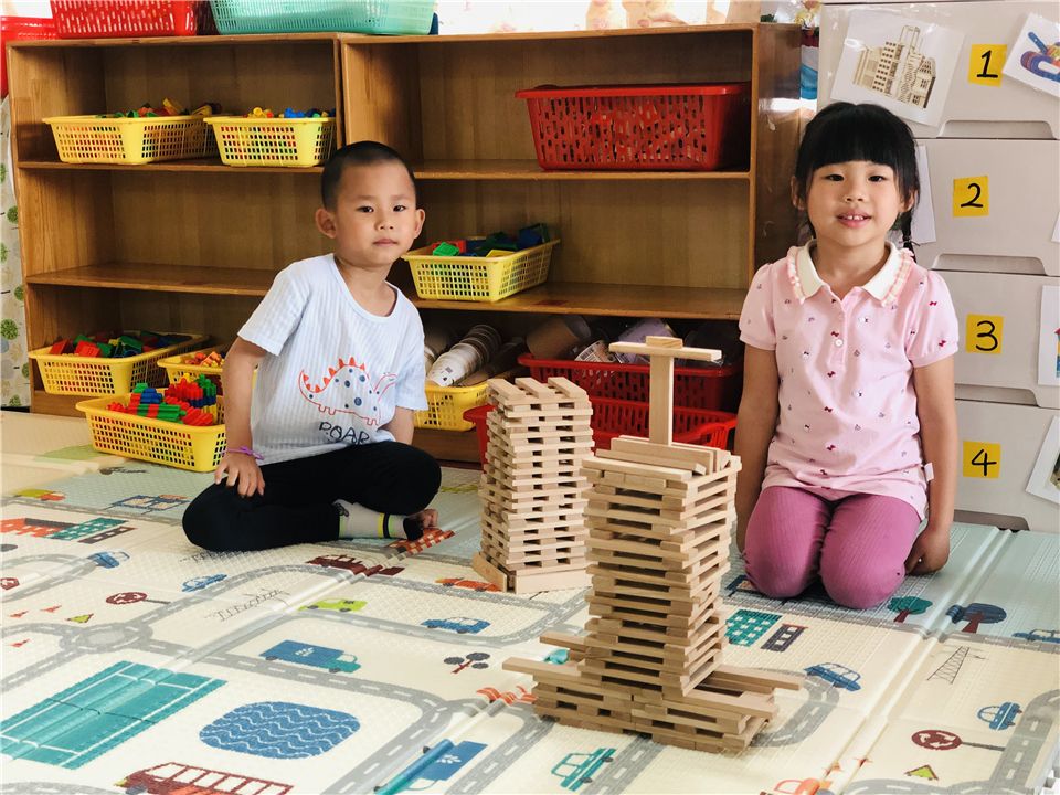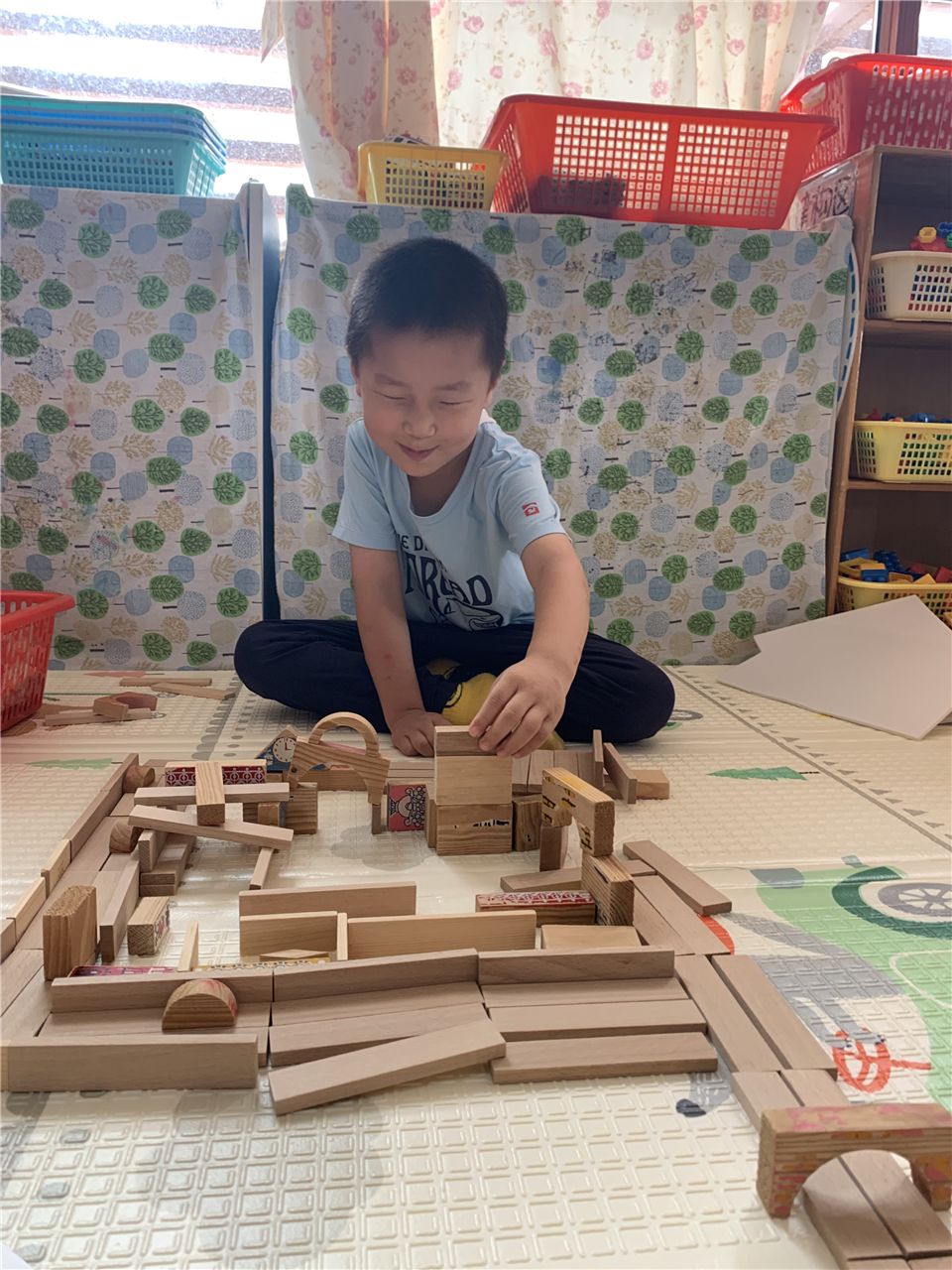 建构区里平铺了两大张的地垫,小朋友们在上面进行平铺、垒高、围合、延展等搭建,他们的构思往往让老师们出乎意料!看看我们的小小建筑师,是不是很棒呀!