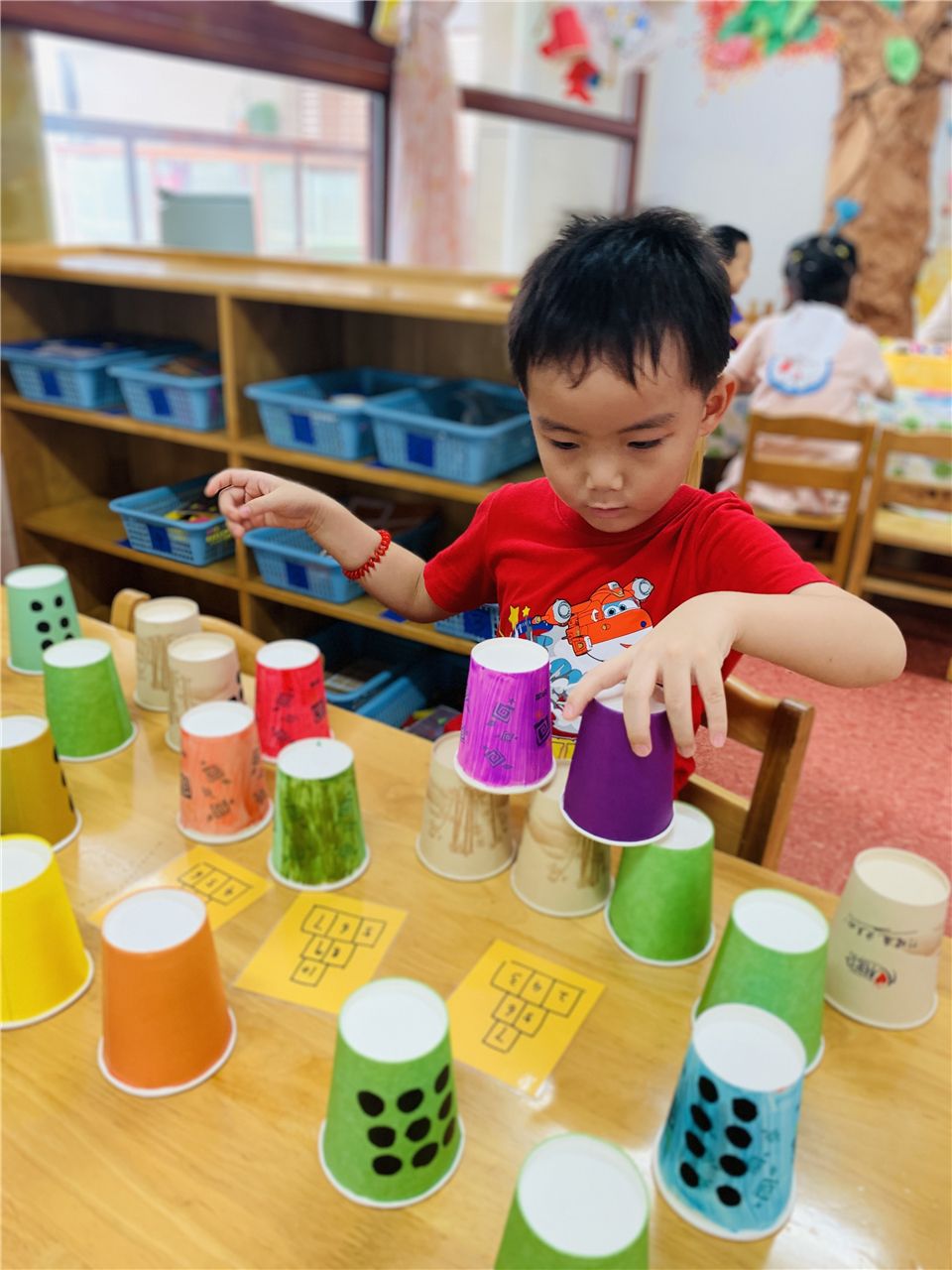 数学区里,几何图形找家、数字叠高楼、数字小火车……天天小朋友一边认真思索一边操作。数学的知识点都融合在操作玩具中,真的做到了在玩中学。