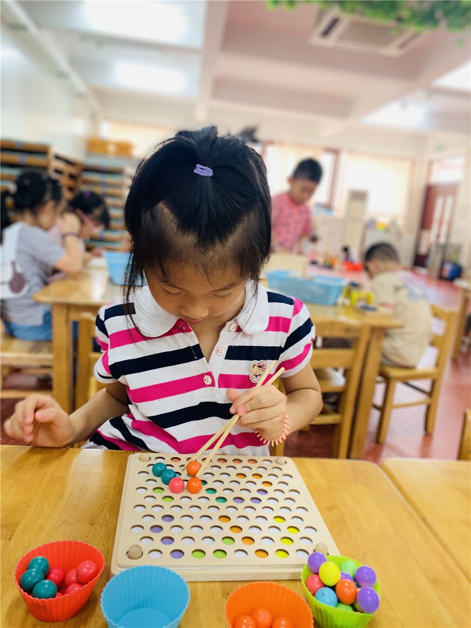 操作区锻炼了小朋友们的动手能力。看,孩子们正在把塑料珠、玻璃珠一粒一粒小心翼翼地夹进小碗里。新投放的螺丝玩具也是小朋友们心头好,通过拧、旋、固定……一个个作品就变出来了。