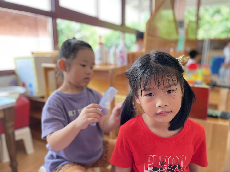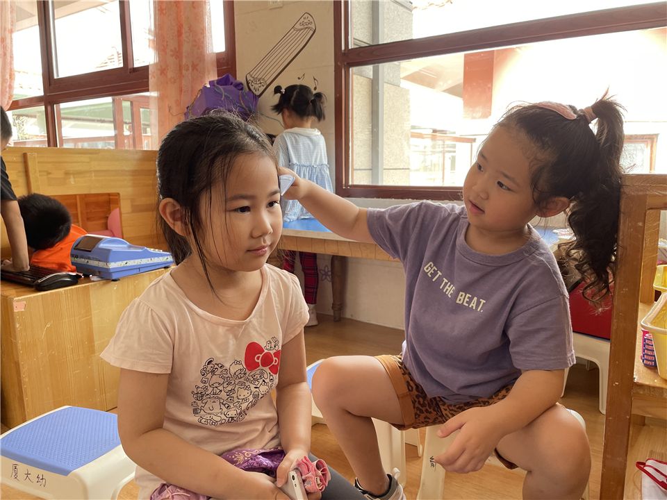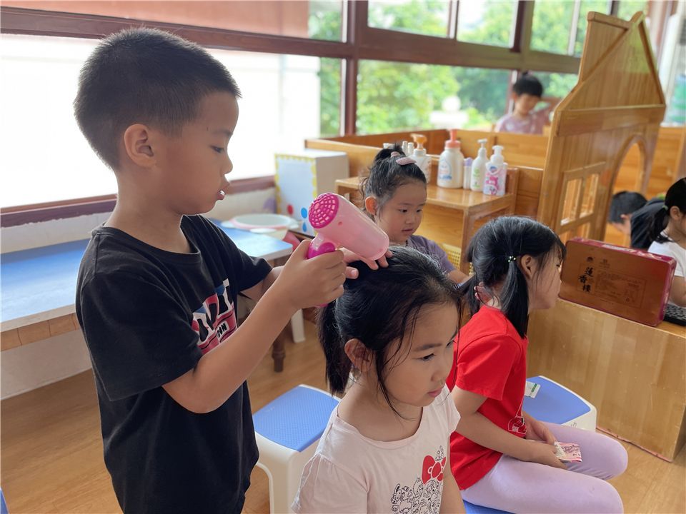 游戏是幼儿的天性也是幼儿重要的学习方式,孩子们利用生活中“洗剪头发”的经验,投入到角色游戏中,通过角色扮演,以模仿、想象,创造性地真实反映理发店的故事。