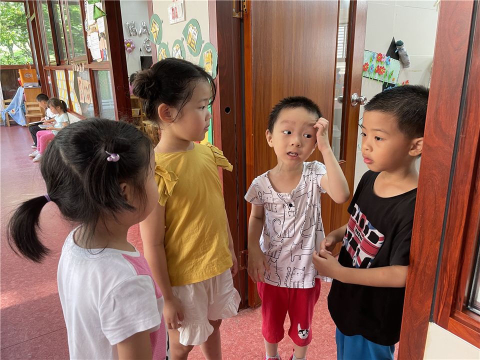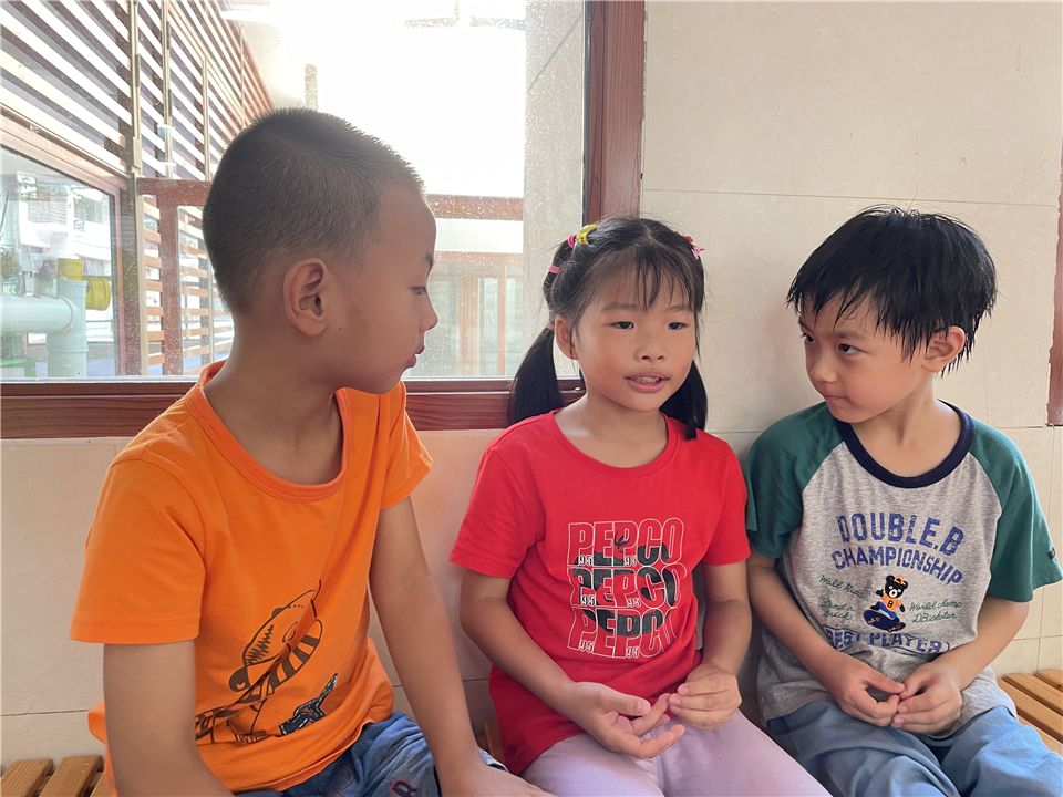 角色游戏后,孩子们热烈地交流着在理发店的游戏体验。