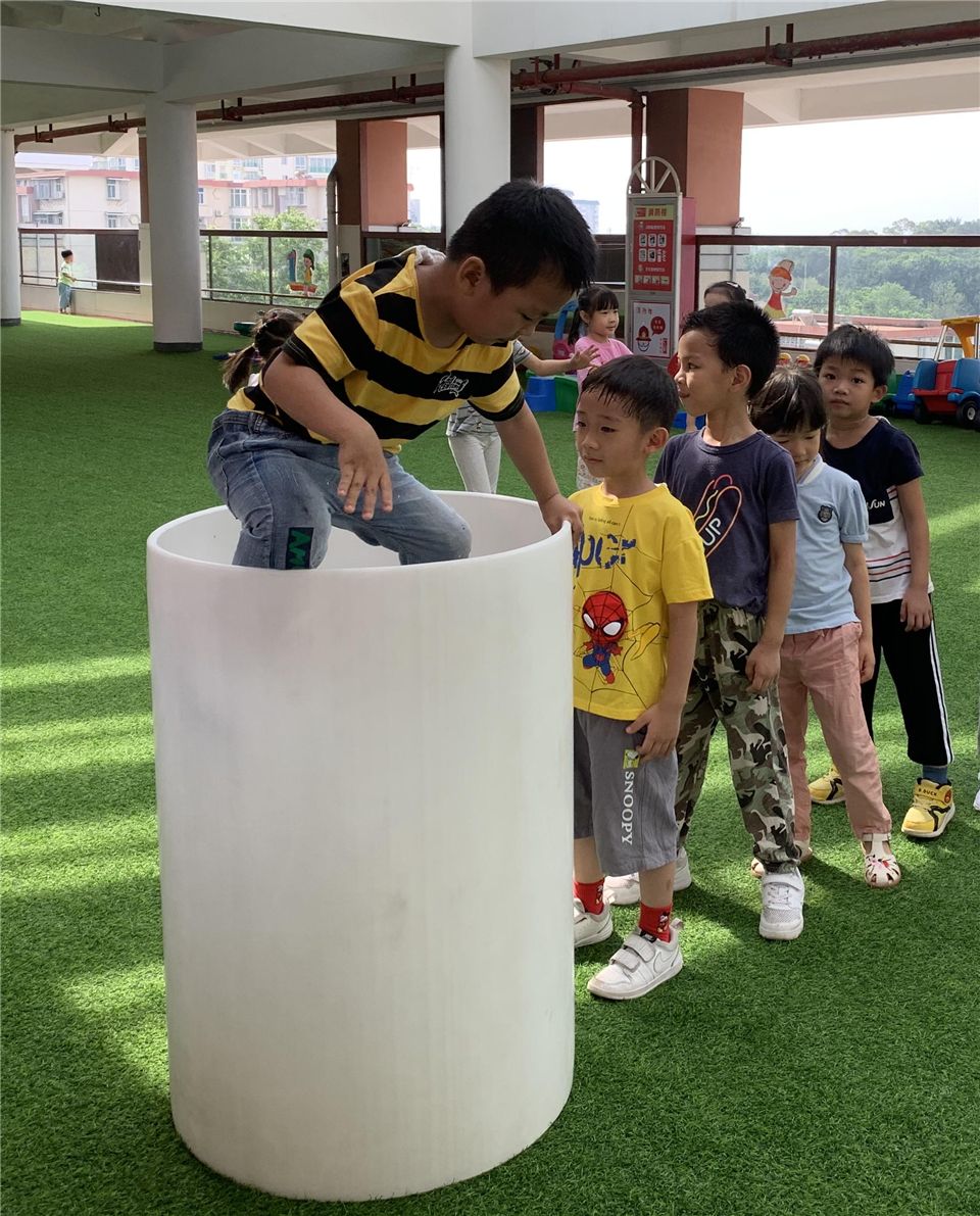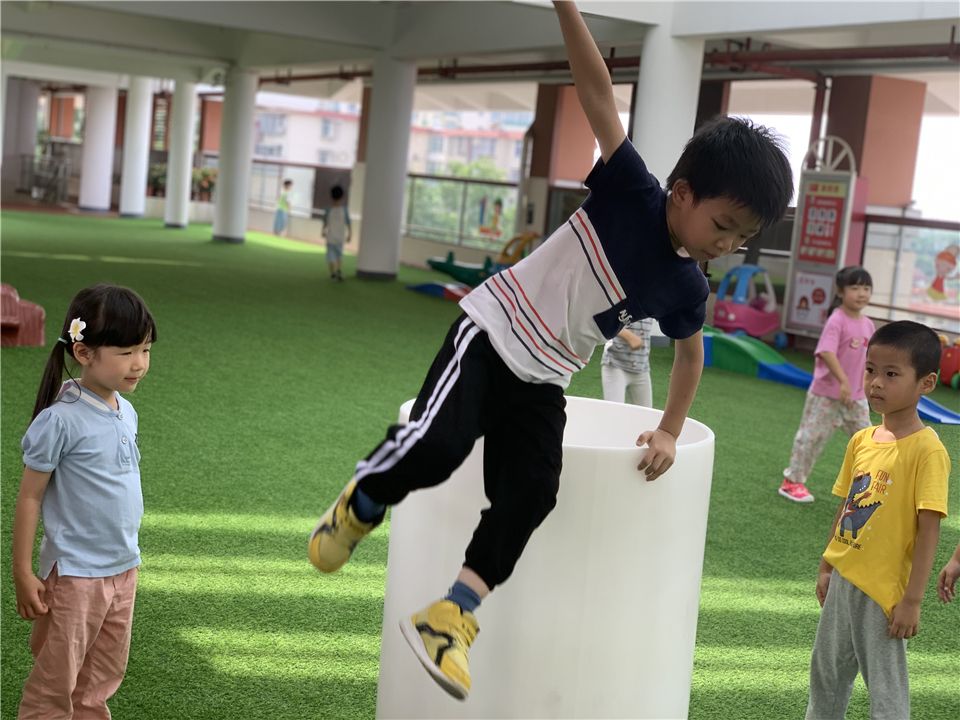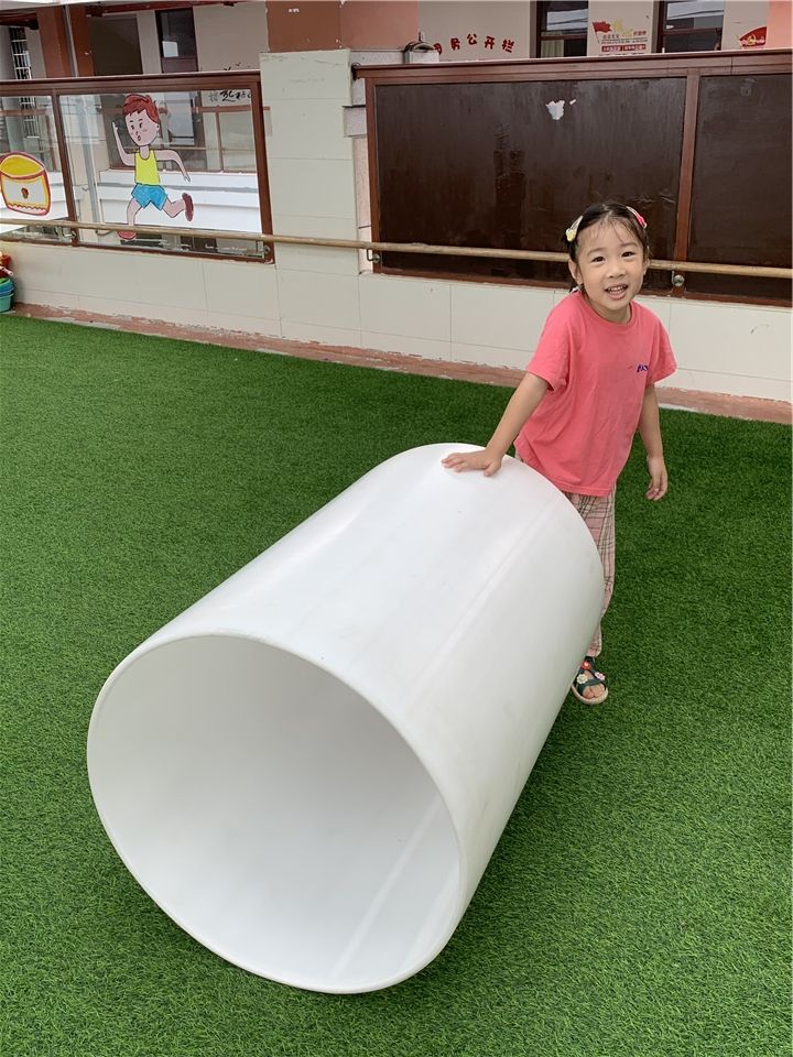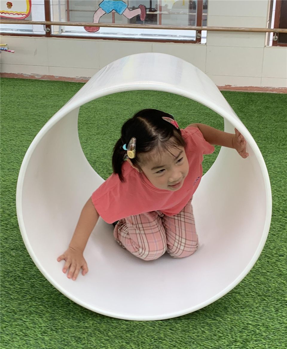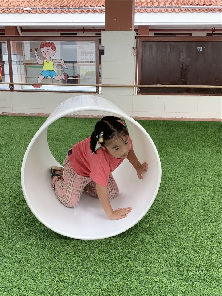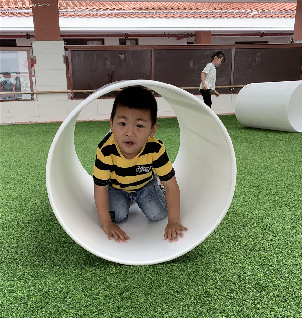 我们在天台户外运动场上与它近距离接触,这幼儿园最大号的管子特别的亮眼,是我们中四班宝贝近期特别热衷于挑战的一个运动器械。
