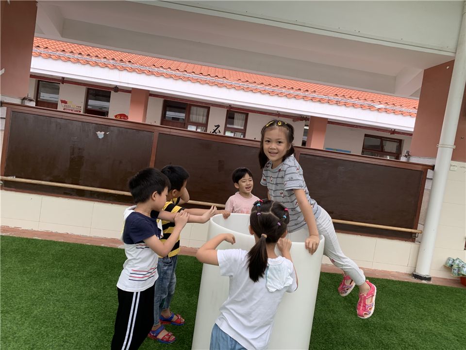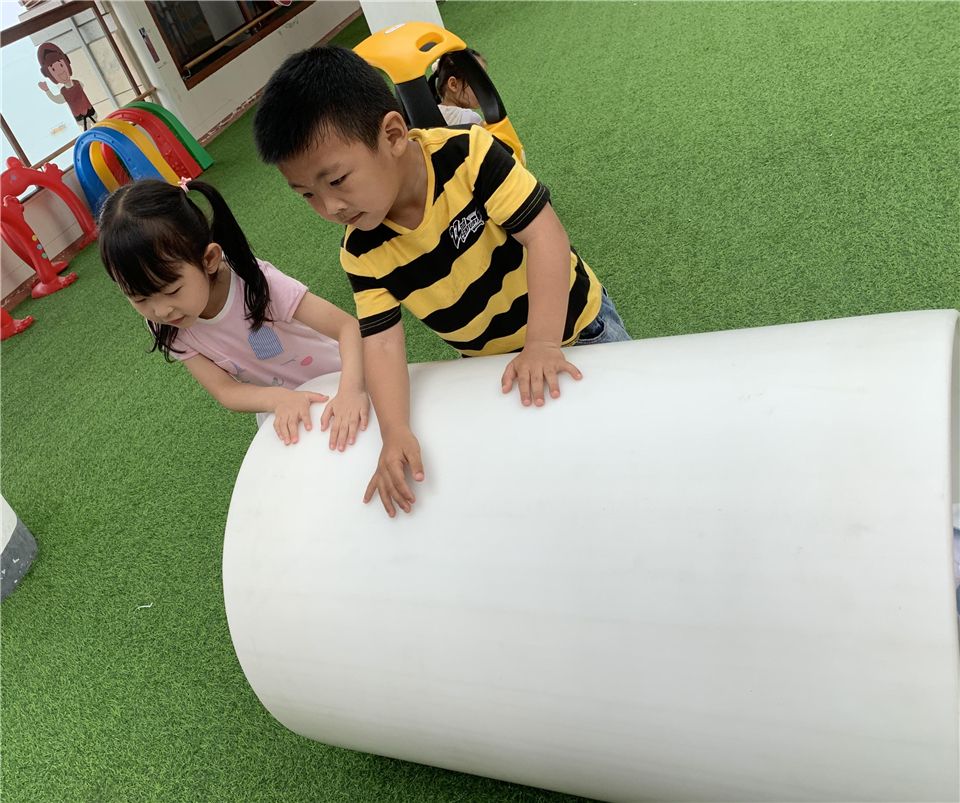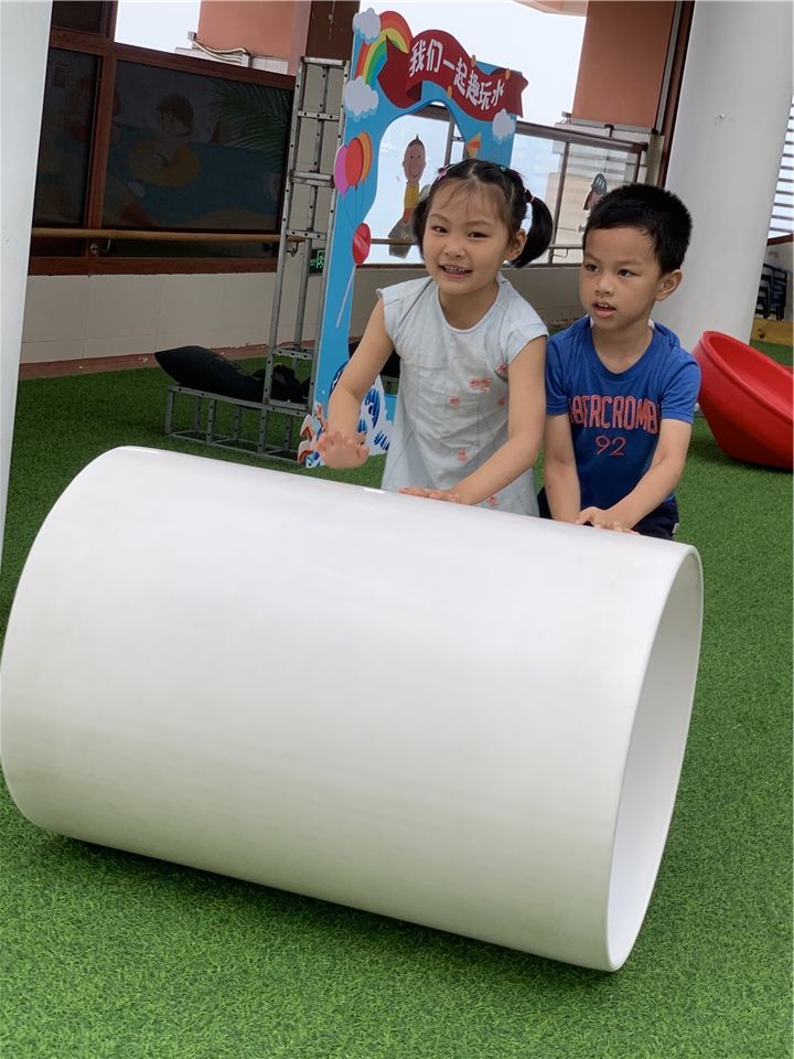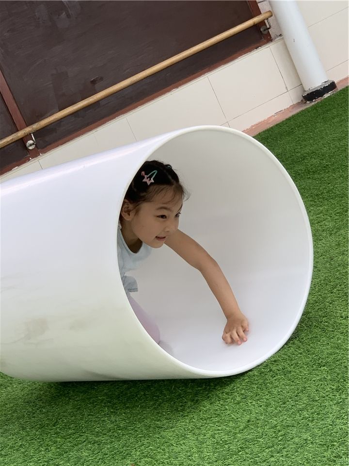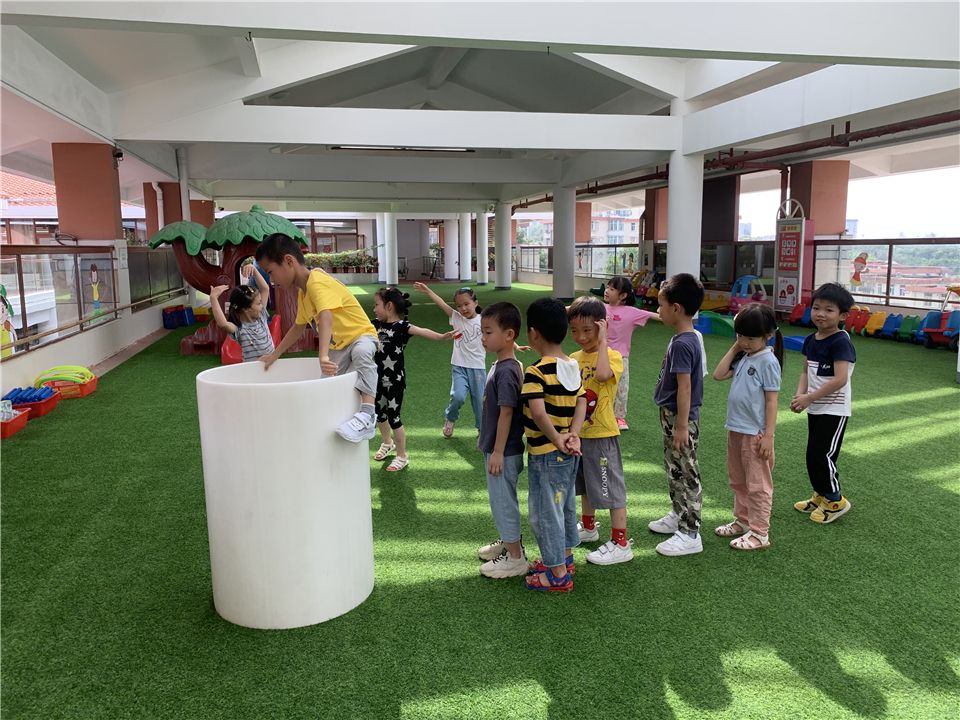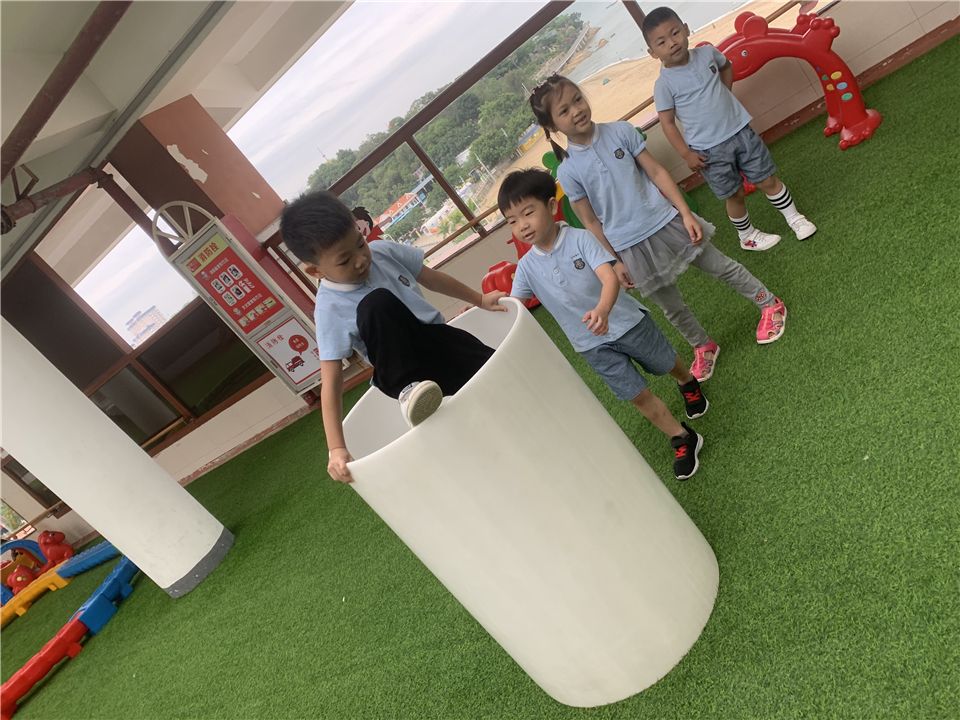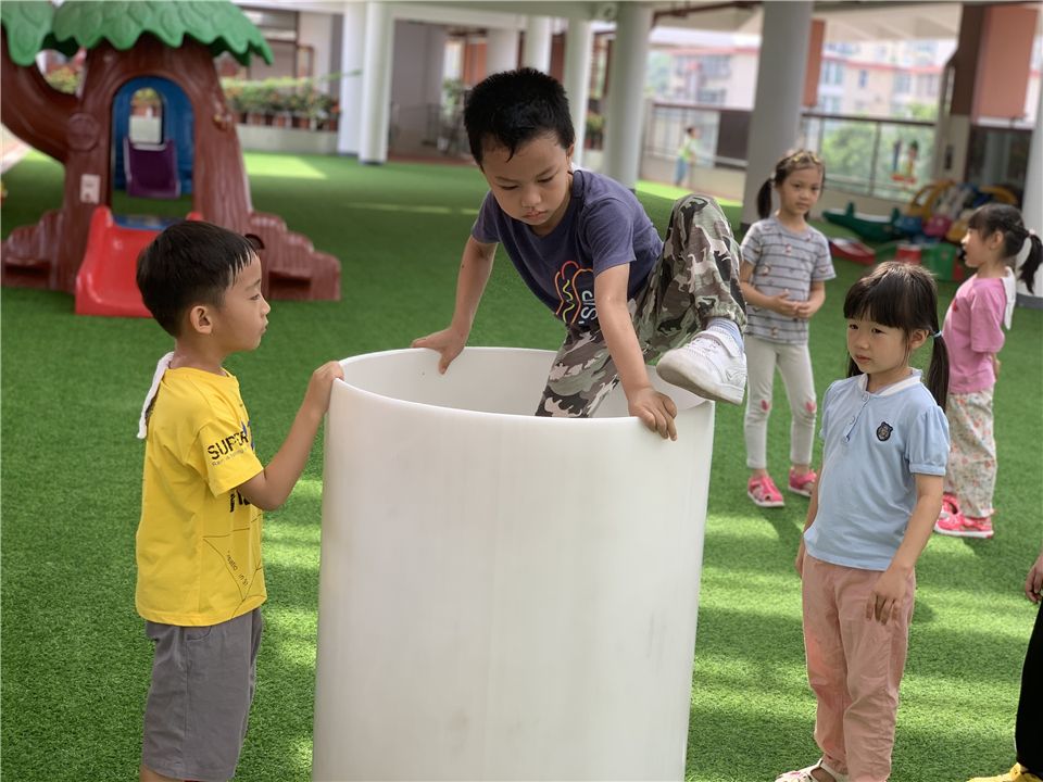 我们在天台户外运动场上与它近距离接触,这幼儿园最大号的管子特别的亮眼,是我们中四班宝贝近期特别热衷于挑战的一个运动器械。